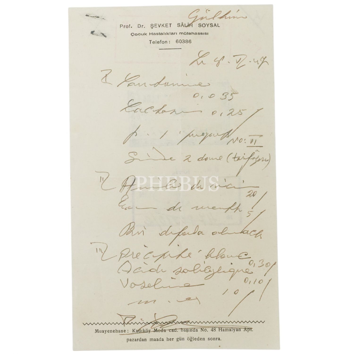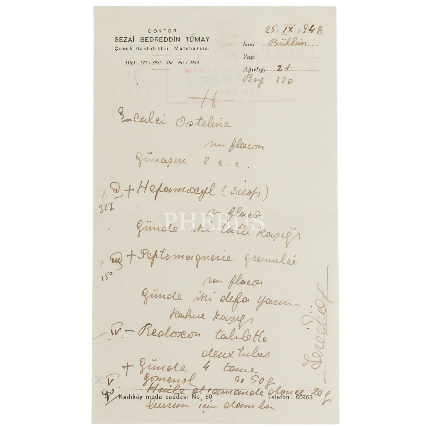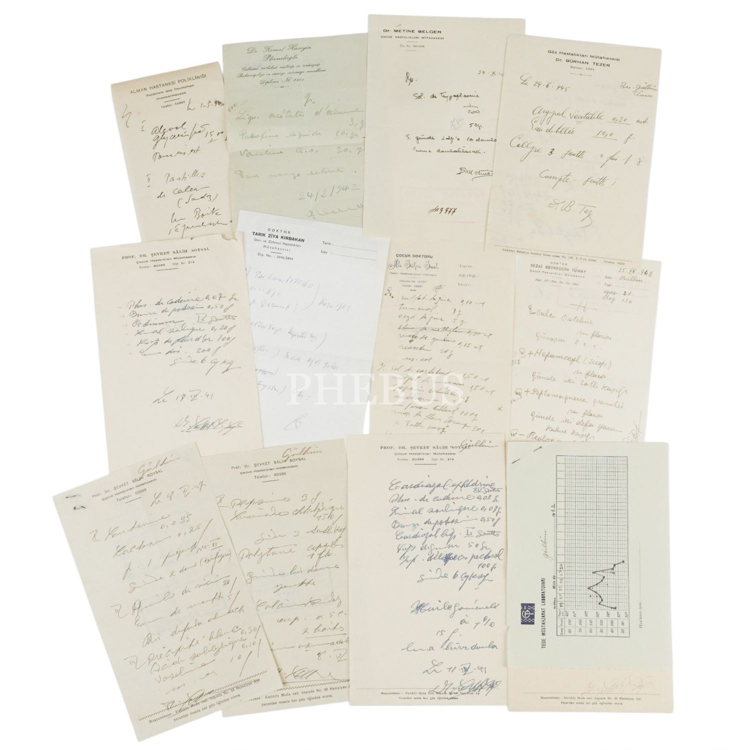 Türk tıp tarihçisi, ressam ve müzehhip Doktor Ahmet Süheyl Ünver´in kızı Gülbün Mesara için düzenlenmiş 12 adet reçete...