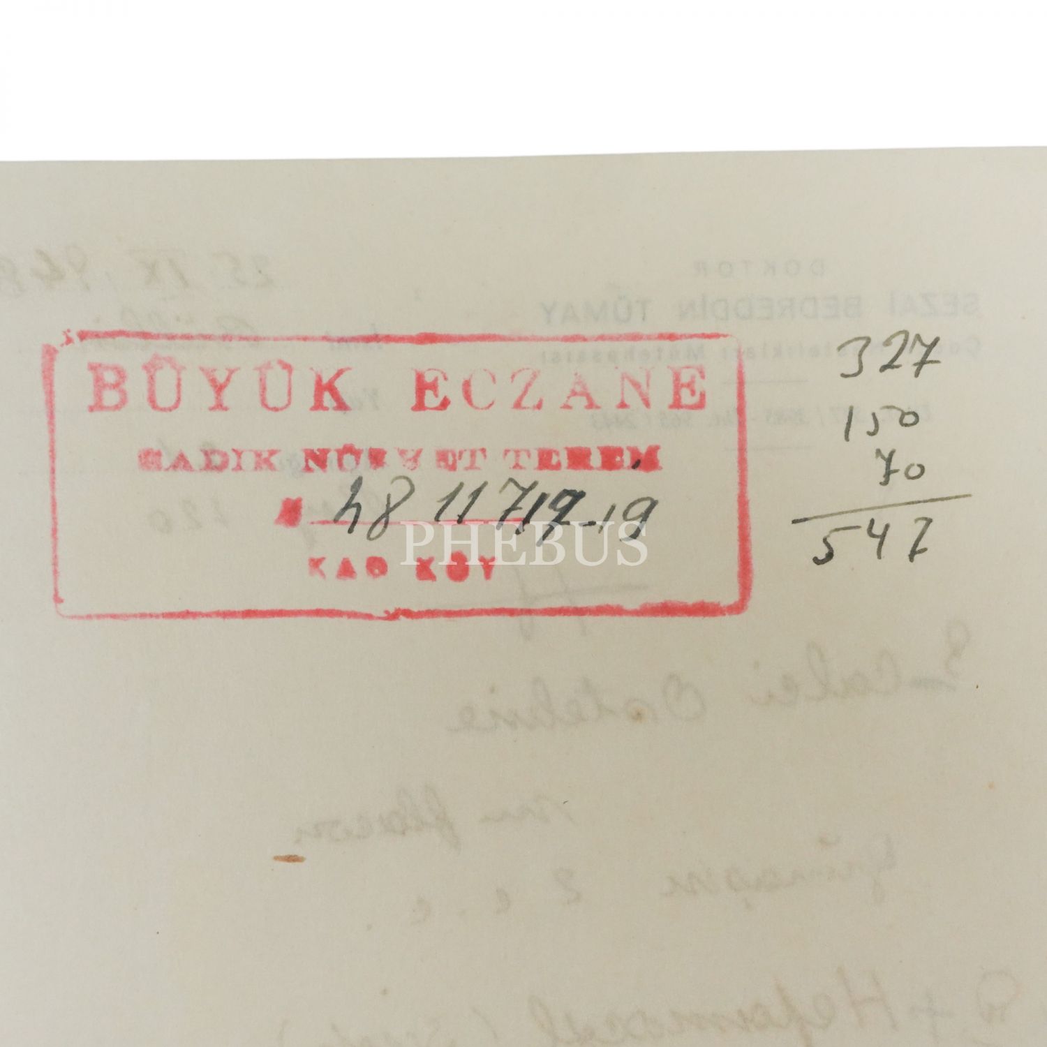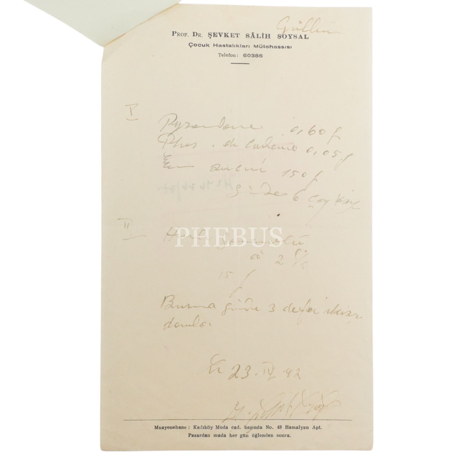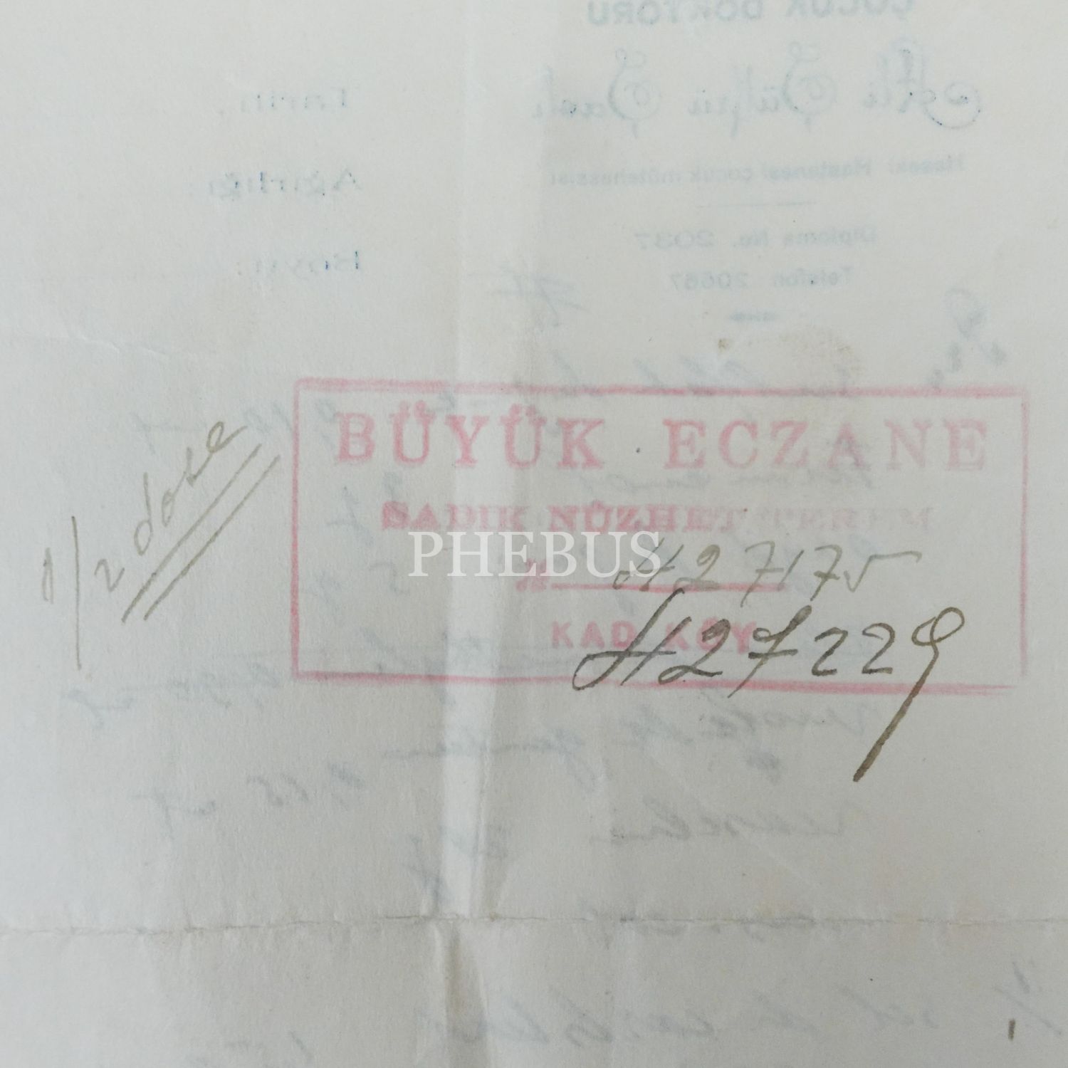 Türk tıp tarihçisi, ressam ve müzehhip Doktor Ahmet Süheyl Ünver´in kızı Gülbün Mesara için düzenlenmiş 12 adet reçete...