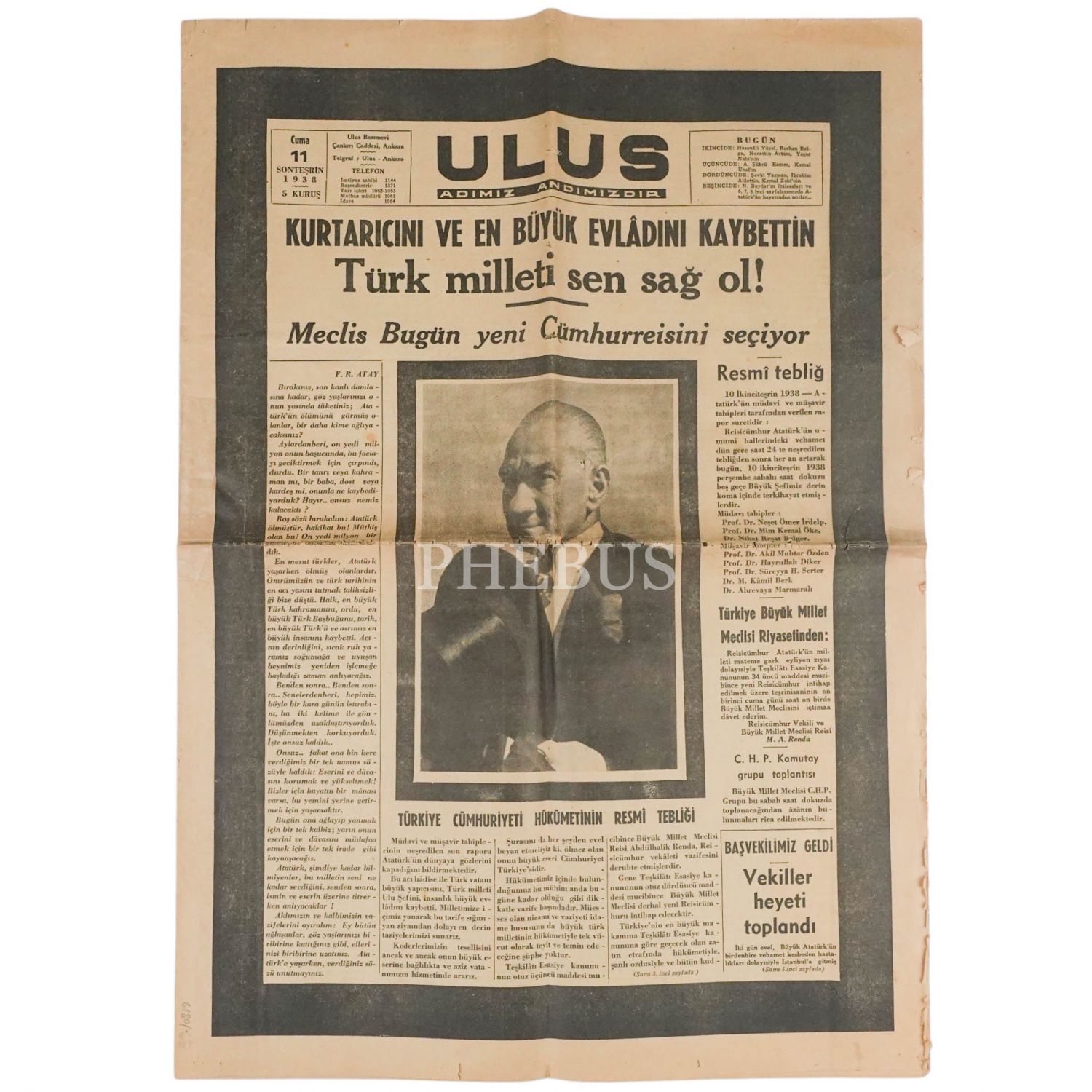 "Kurtarıcını ve En Büyük Evlâdını Kaybettin Türk Milleti Sen Sağ Ol!" manşetiyle, Mustafa Kemal Atatürk´ün vefat haberini duyuran ULUS gazetesi, 11 Sonteşrin (Kasım) 1938, 12 sayfa, 42x60 cm...