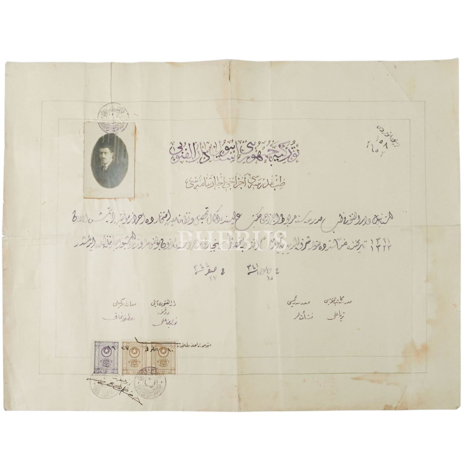 İstanbul Darülfünunu Tıp Medresesi tarafından Şerafeddin Timurşah´a verilen ve el ile hazırlanmış eczacı diploması, 15 Kanunuevvel 1341 (15 Aralık 1925), 42x33 cm...