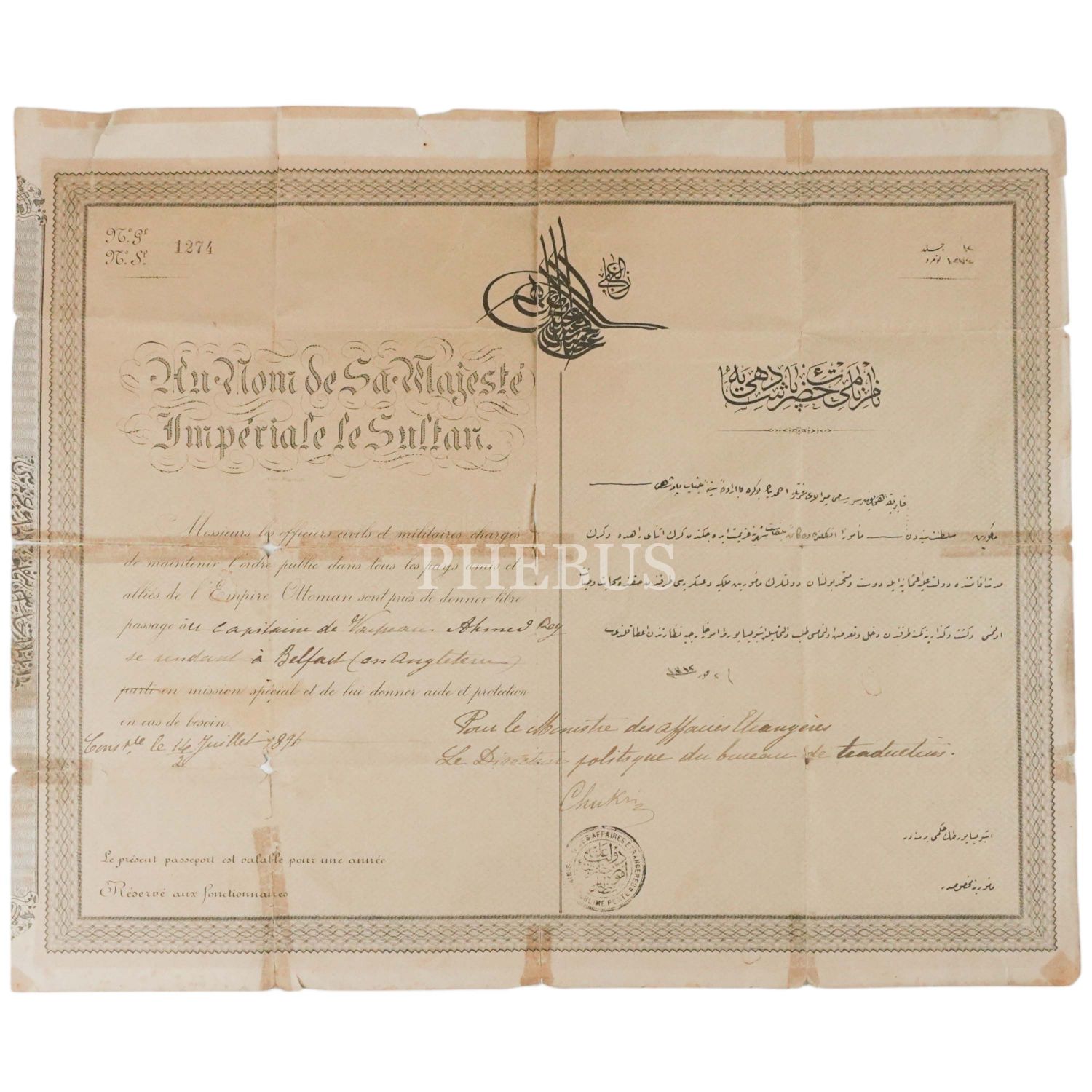 Miralay Ahmet Bey´in İngiltere´de bulunan Belfast şehrine yapacağı ziyaret için düzenlenmiş, Sultan İkinci Abdülhamid tuğralı pasaport, 2 Temmuz 1312, 46x39 cm...