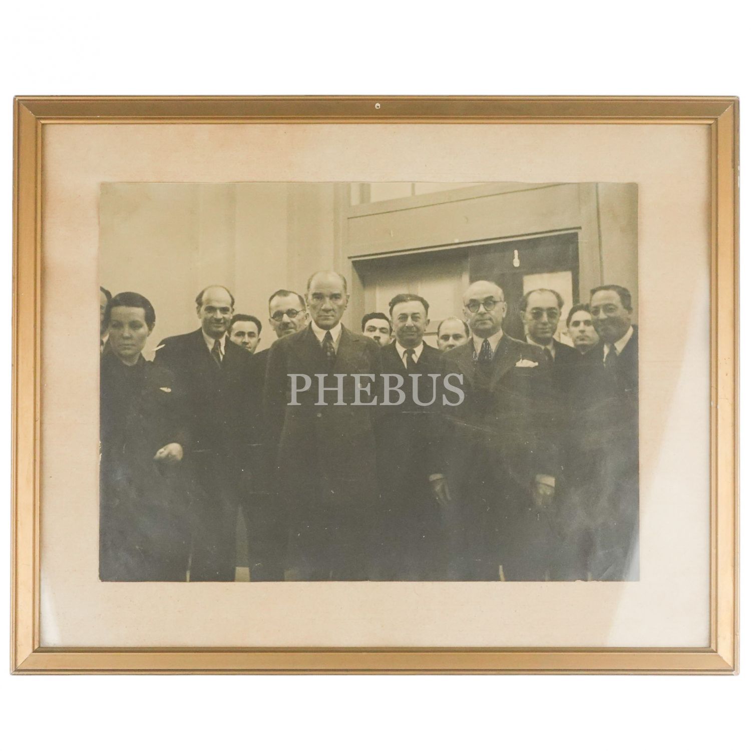 Mustafa Kemal Atatürk, Celal Bayar, Tevfik Rüştü Aras, Şükrü Kaya ve Sabiha Gökçen´in bir arada görüldüğü büyük boy fotoğraf, fotoğraf 39x29 cm, çerçeve 53x42 cm...