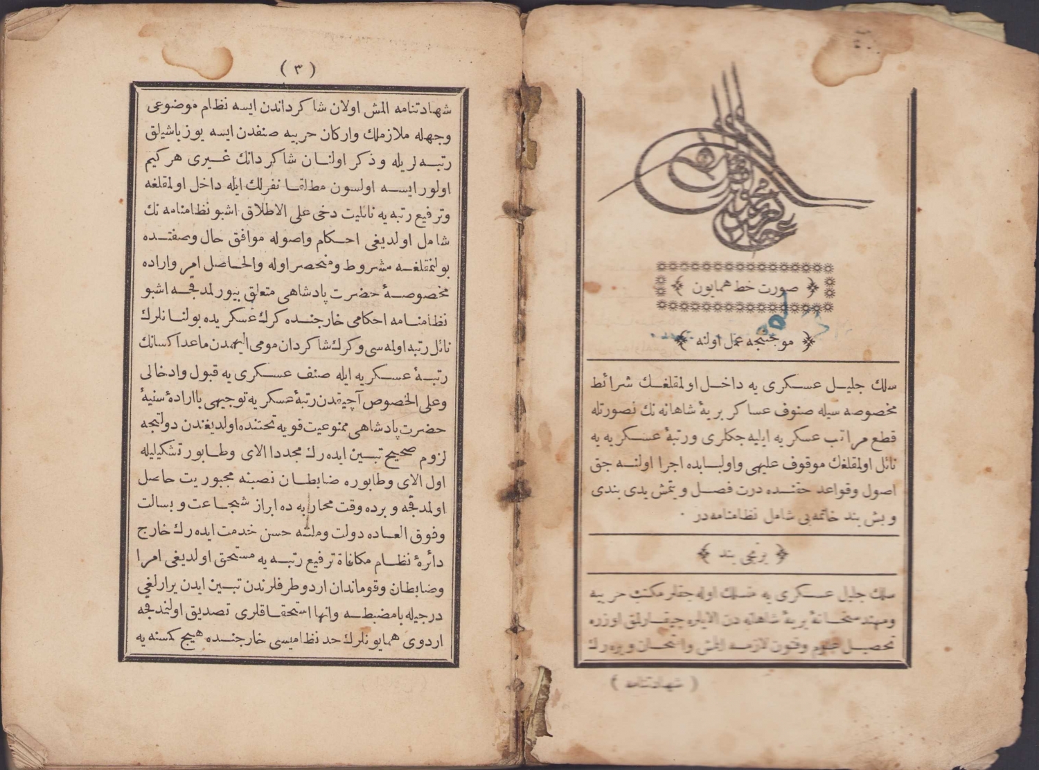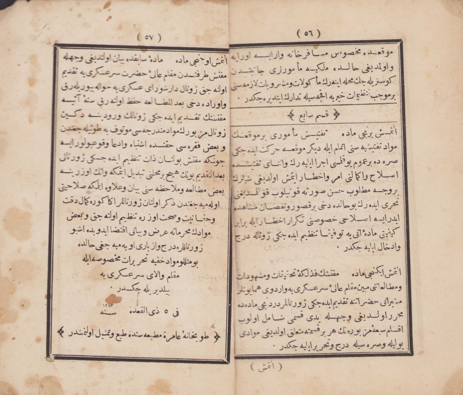 Osmanlıca Suret-i Hattı Hümayun - Terfi Rütbe Kanunamesi, Tophane-i Amire Matbaası, 1283, cilt haliyle, 57 sayfa, 12x18 cm