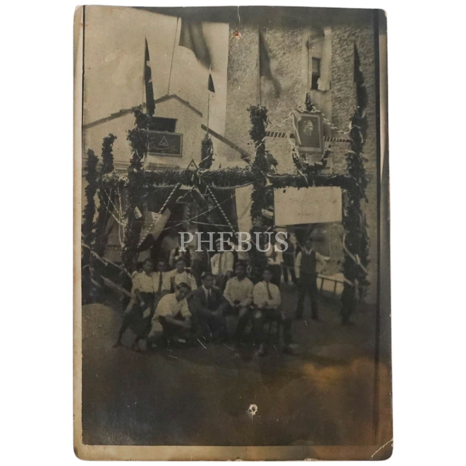 Mustafa Kemal Atatürk´ün İstanbul´u ziyareti esnasında Cihangir Spor Kulübü´nün sporcuları tarafından kulübün girişine kurulan zafer takı ve sporcular, 9x13 cm...