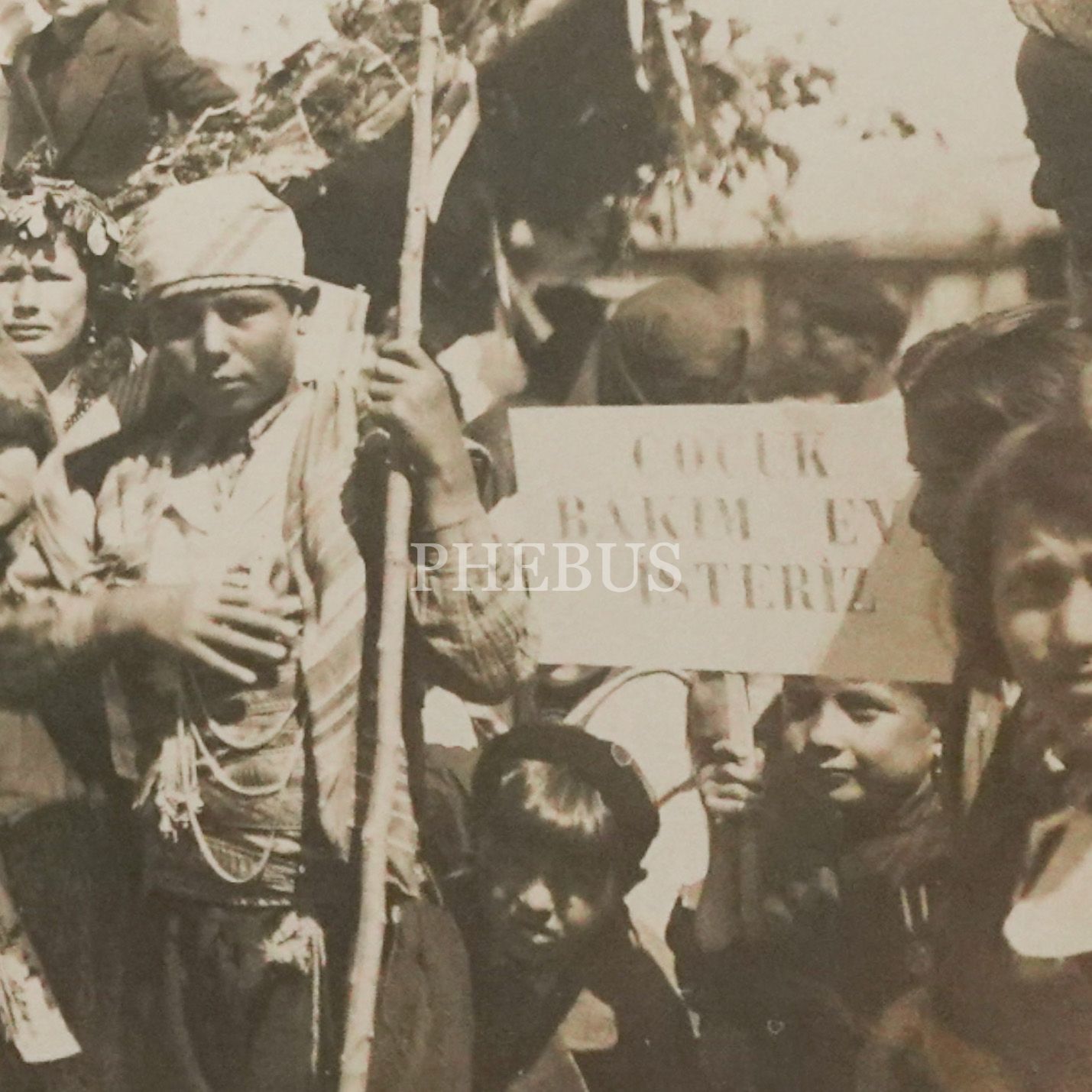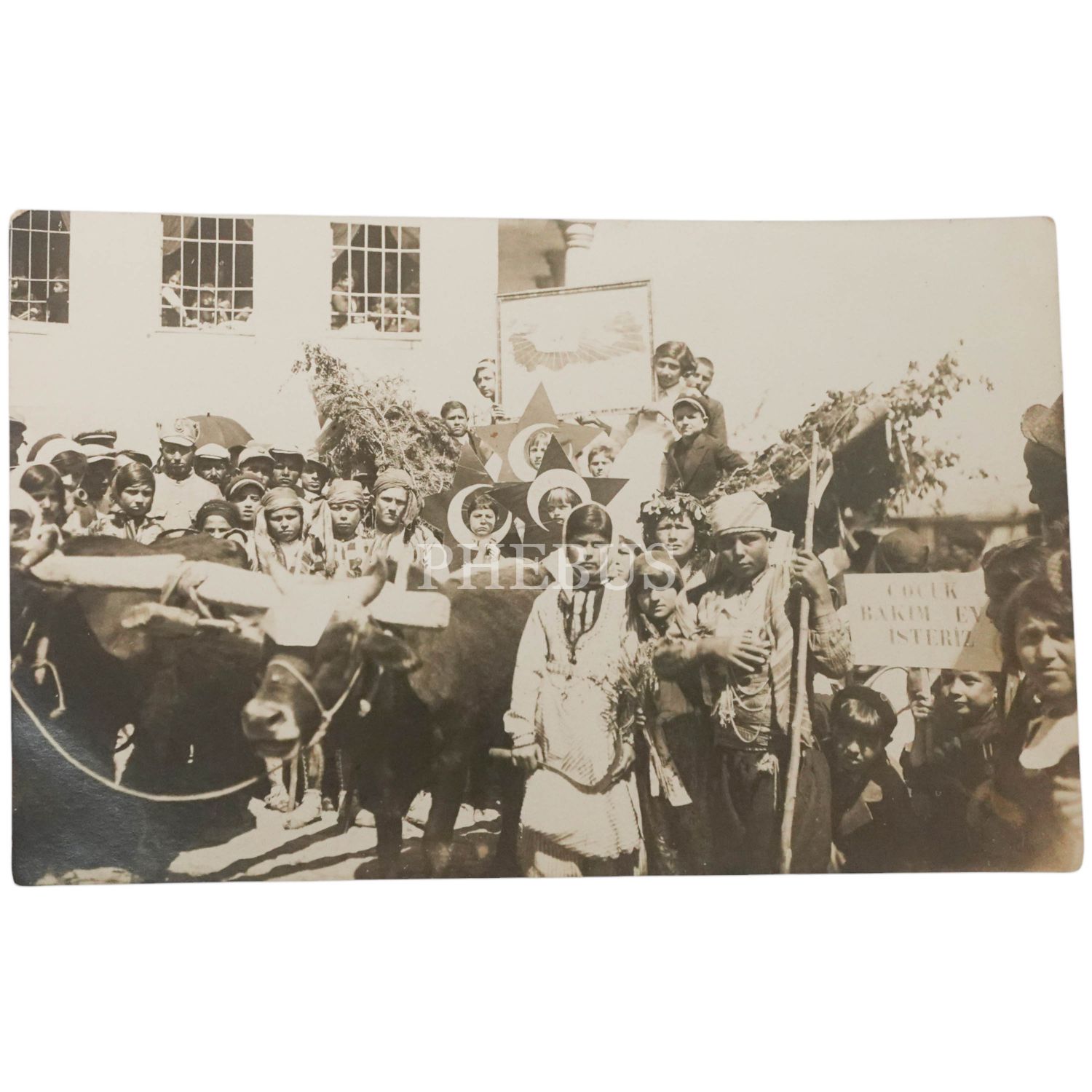 23 Nisan töreni için kimi yöresel kıyafetler giymiş, kimiyse özel olarak hazırlanmış ay-yıldız formundaki kukuletaları başına geçirmiş minik öğrenciler... İçlerinden birinin elinde "Çocuk Bakım(ı) / Ev İsteriz" yazılı bir pankart görülmektedir, 14x9 cm...