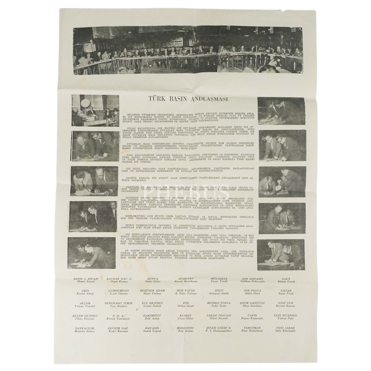 27 Mayıs döneminden, Partilerarası Müşterek Beyanname´nin yayımlanmasından sonra düzenlenen ´basın yuvarlak masa toplantısı´ sonrası yayımlanan "Türk Basın Andlaşması" afişi... Afişte, Ulus gazetesini temsilen Bülent Ecevit´in ismi yer almaktadır, 50x70 cm...
