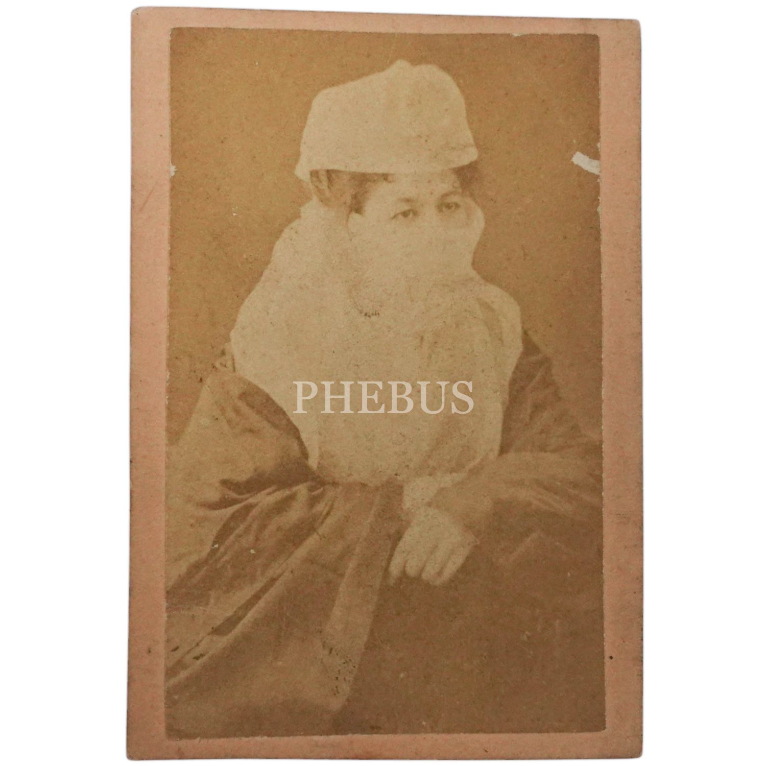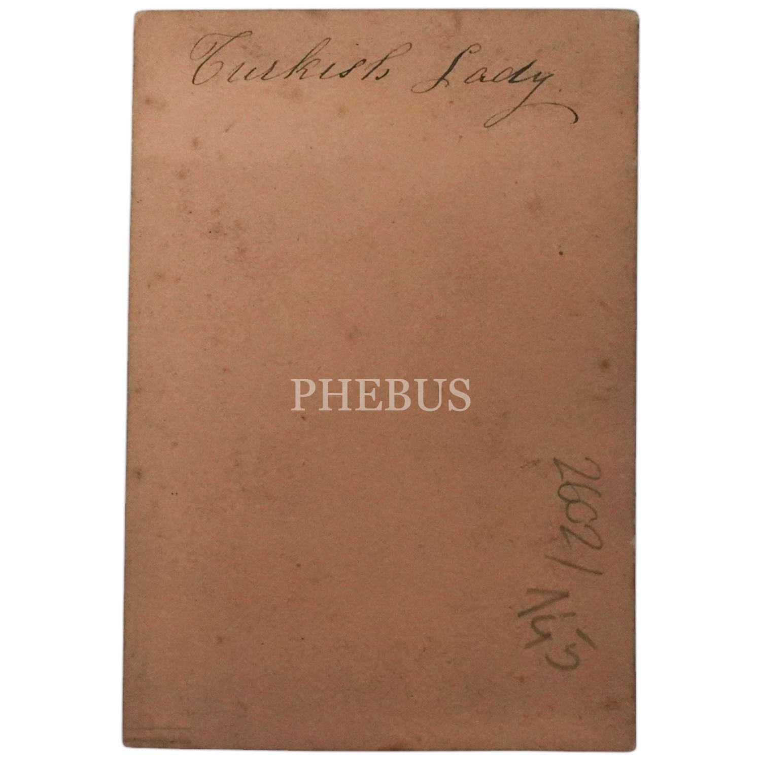 Osmanlı fotoğrafhanelerinin genellikle Batılı turistlere satmak amaçlı hazırladığı oryantal giysili Türk kadını serilerinden CDV (kartvizit) boy bir numune, 1860-70´li yıllar
