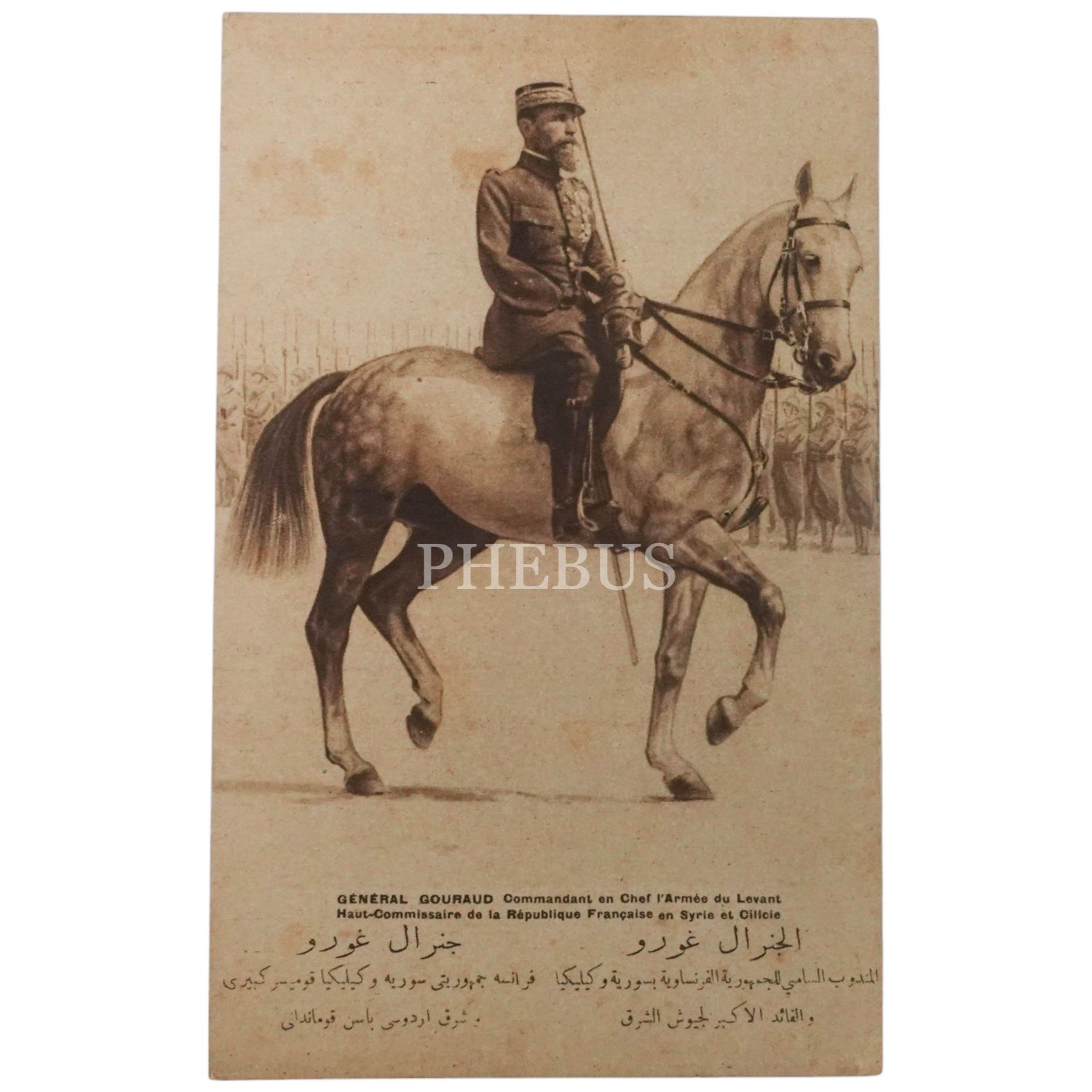 Çanakkale Savaşı´nda bir kolunu kaybeden Fransız General Joseph Étienne Gouraud´un, Suriye ve Kilikya (Adana) Yüksek Komiserliği görevini ifa ederken yayımlanmış Fransızca-Osmanlıca-Arapça açıklamalı kartpostalı, 9x14 cm...