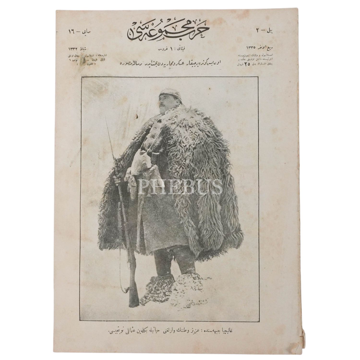 I. Dünya Savaşı´nda Galiçya Cephesi´nde savaşan Osmanlı askerinin fotoğrafına kapağında yer veren HARB MECMUASI´nın Şubat 1333 tarihli 16. sayısı, 24x33 cm...