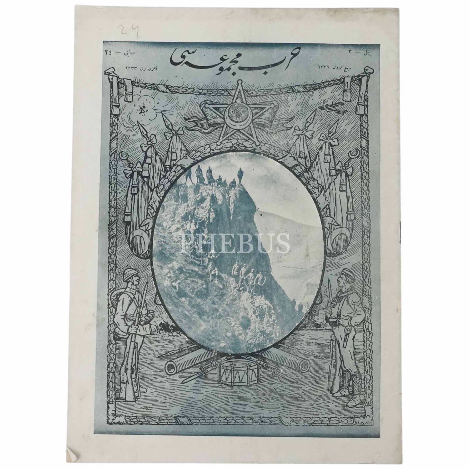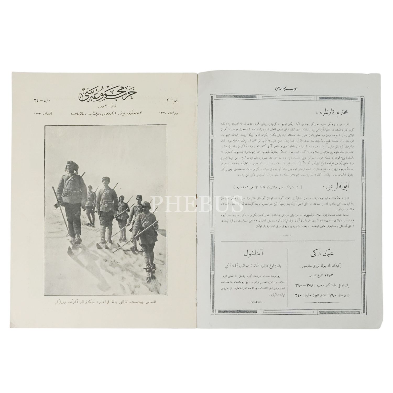 I. Dünya Savaşı´nda Kafkas Cephesi´nde savaşan kızaklı bölüğün fotoğrafına iç kapağında yer veren HARB MECMUASI´nın Kanunuevvel 1333 tarihli 24. sayısı, 24x33 cm...