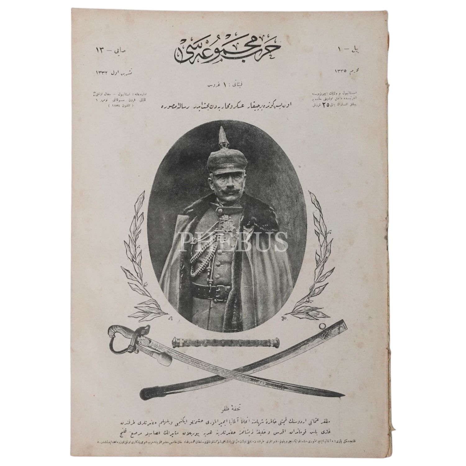 Alman İmparatoru Wilhelm´in fotoğrafına kapağında yer veren HARB MECMUASI´nın Muharrem 1335 tarihli 13. sayısı, 25x35 cm...