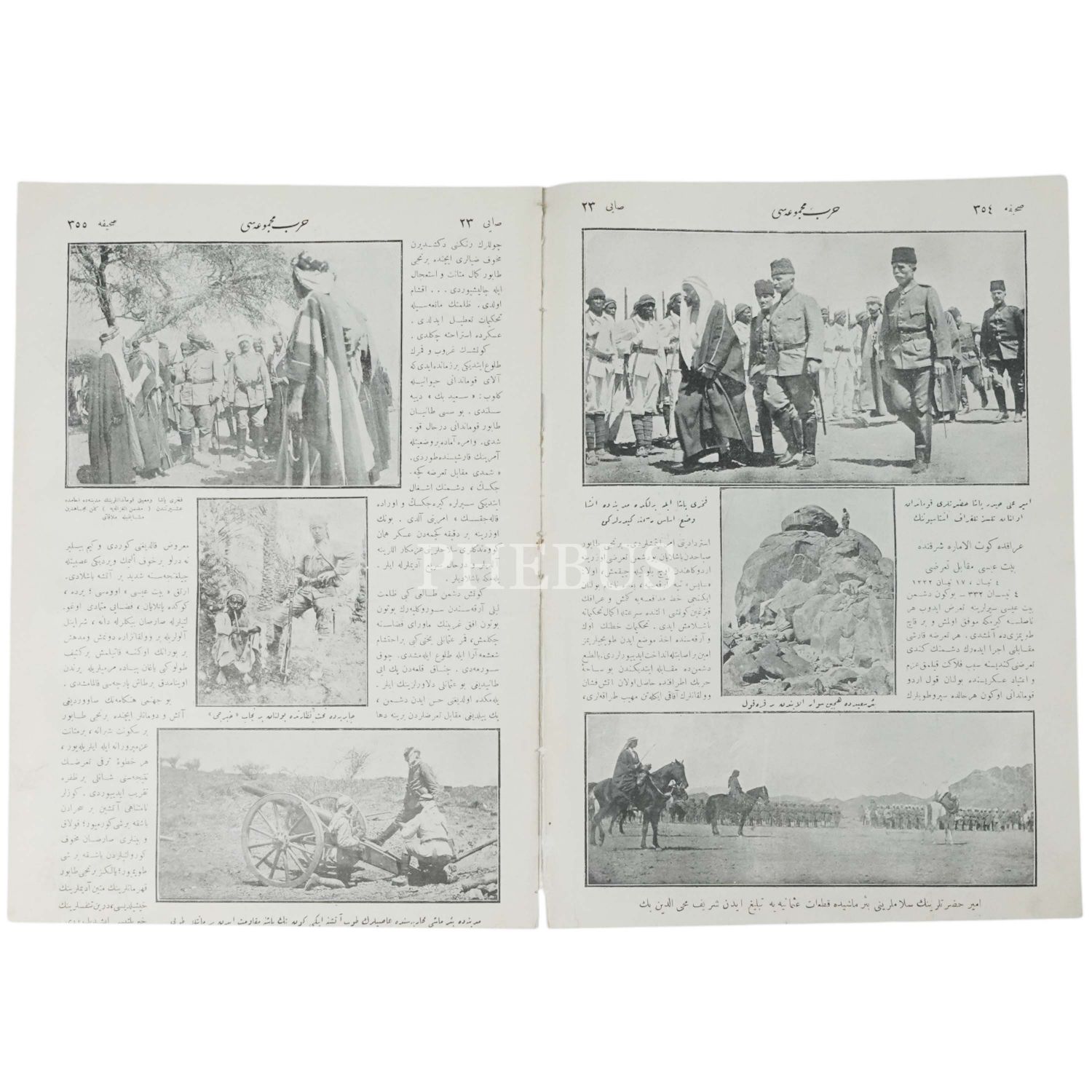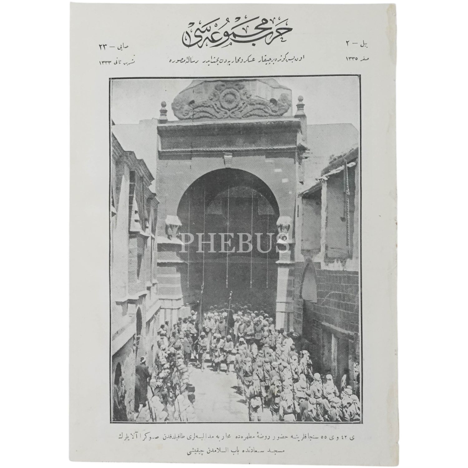 42. ve 55. Alayların sancağına Ravza-i Mutahhara´da Harp Madalyası takılması merasiminde çekilmiş fotoğrafa kapağında yer veren HARB MECMUASI´nın Teşrinisani 1333 tarihli 23. sayısı, 24x33 cm...