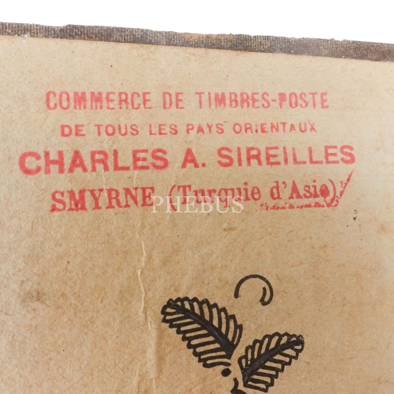 Ön kapak içinde, İzmir merkezli pulcu Charles A. Sireilles´in, "Syrne" (İzmir) ibareli Fransızca firma damgası yer almaktadır: "Commerce de Timbres-Poste de Tous les Pays Orientaux Charles A. Sireilles - Smyrne (Turquie d´Asie)"
