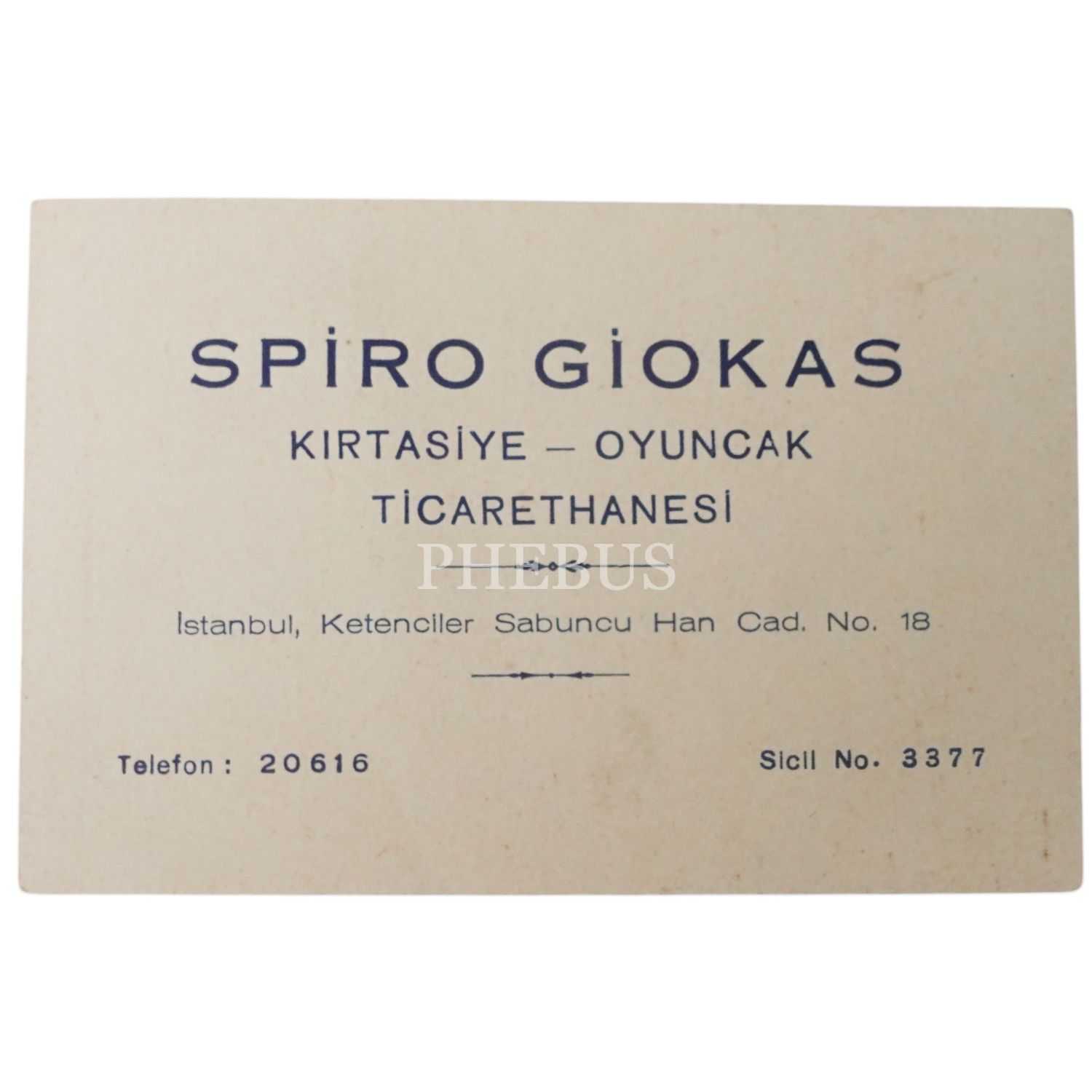 Spiro Giokas Kırtasiye - Oyuncak Ticarethanesi (İstanbul, Ketenciler Sabuncu Han Cad. No. 18) reklamlı işyeri kartı, 12x8 cm...
