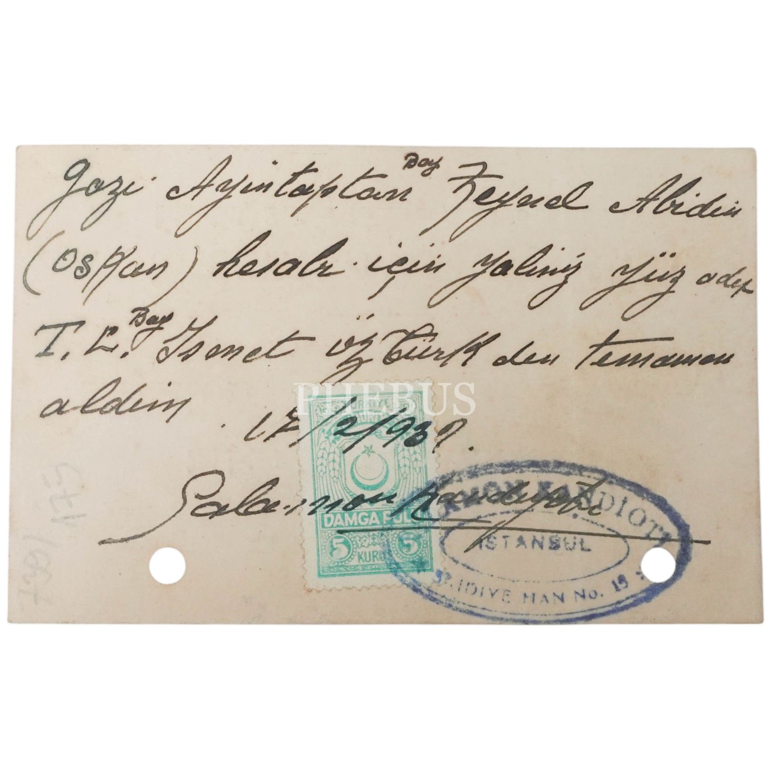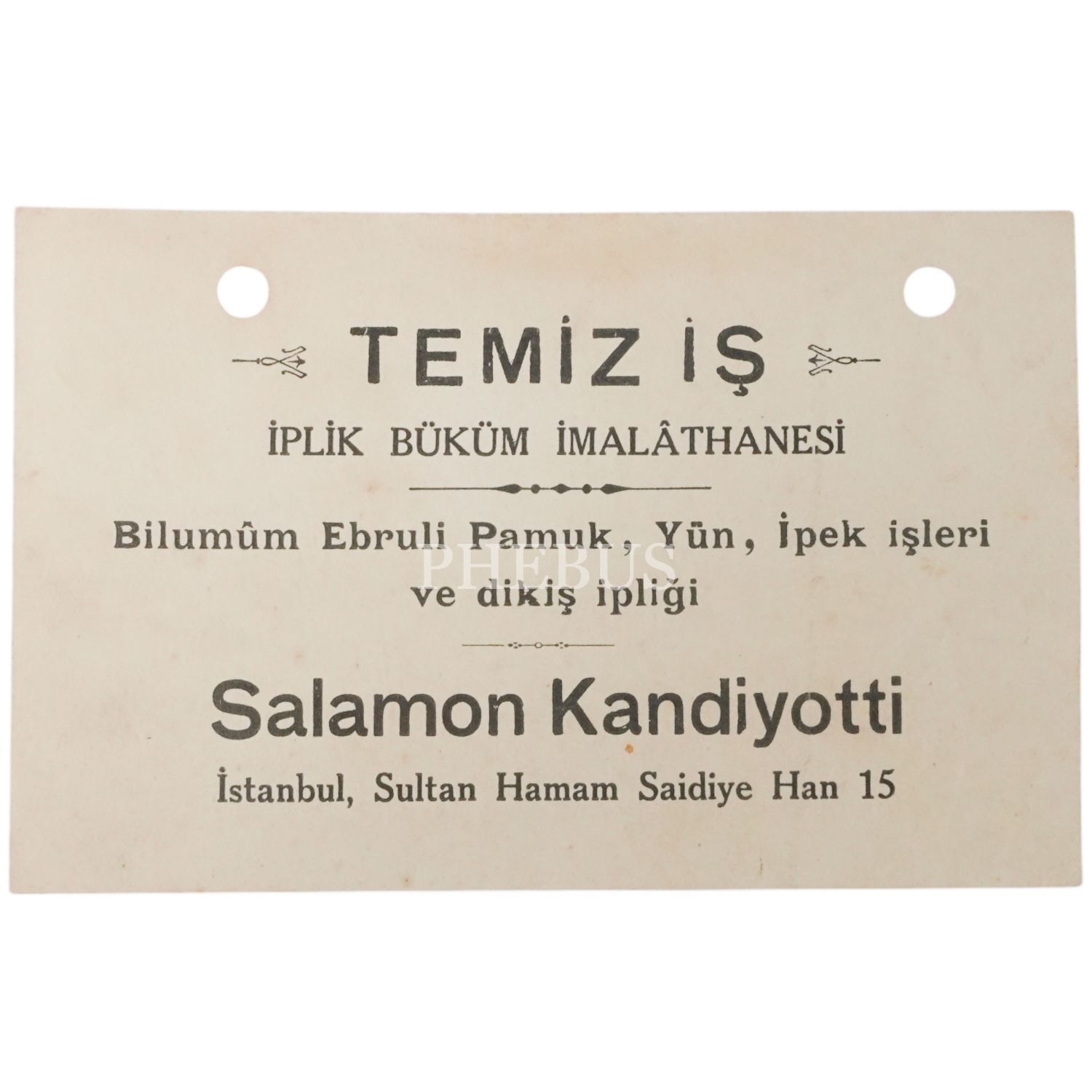 Salamon Kandiyotti - Temiz İş İplik Büküm İmalâthanesi (Bilumûm Ebruli Pamuk, Yün, İpek İşleri ve Dikiş İpliği) - İstanbul, Sultan Hamam Saidiye Han 15 reklamlı işyeri kartı, 13x8 cm...