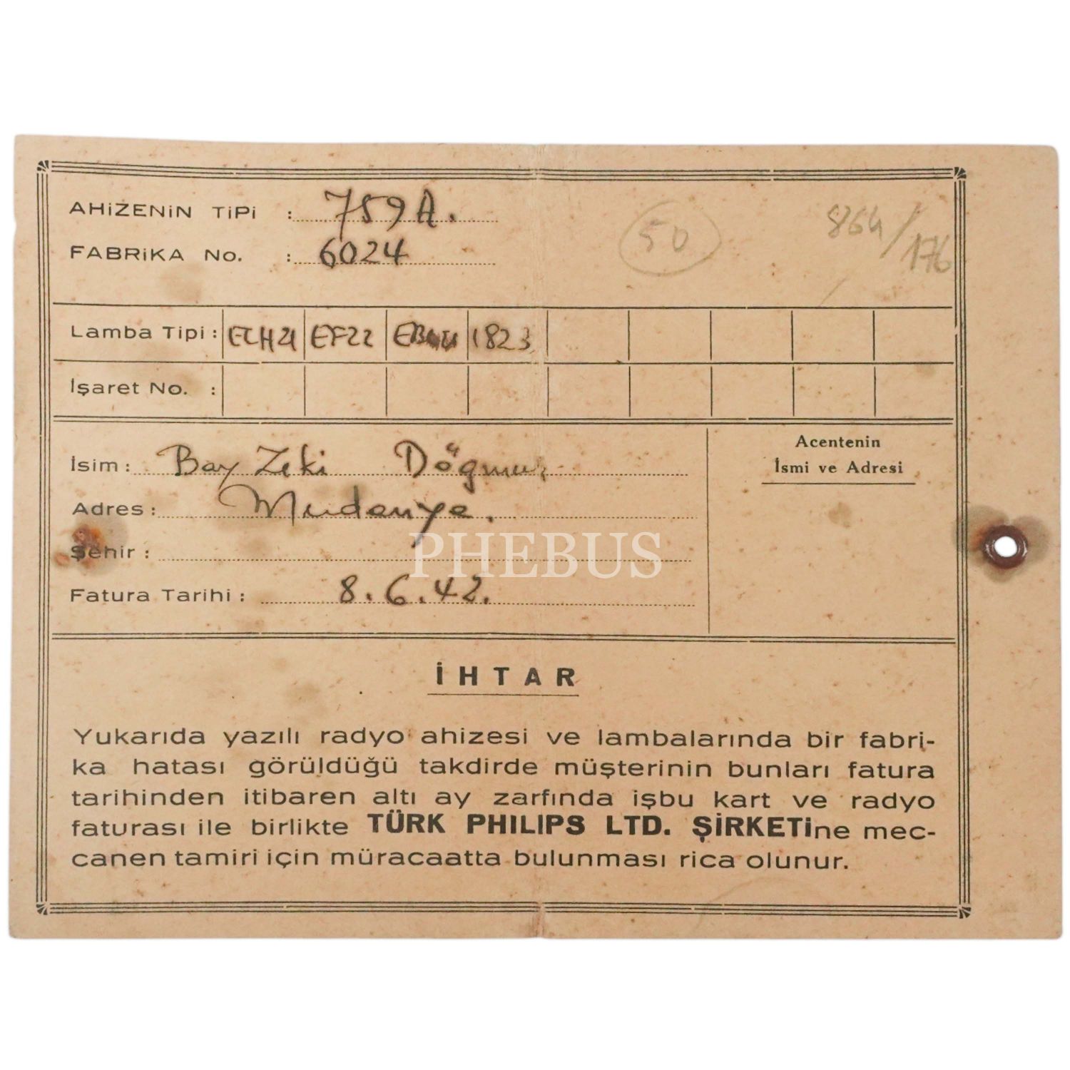 Philips reklamlı, 1942 tarihli garanti belgesi, Mudanya´da yaşayan Zeki Doğmuş adına düzenlenmiş, 18x14 cm...