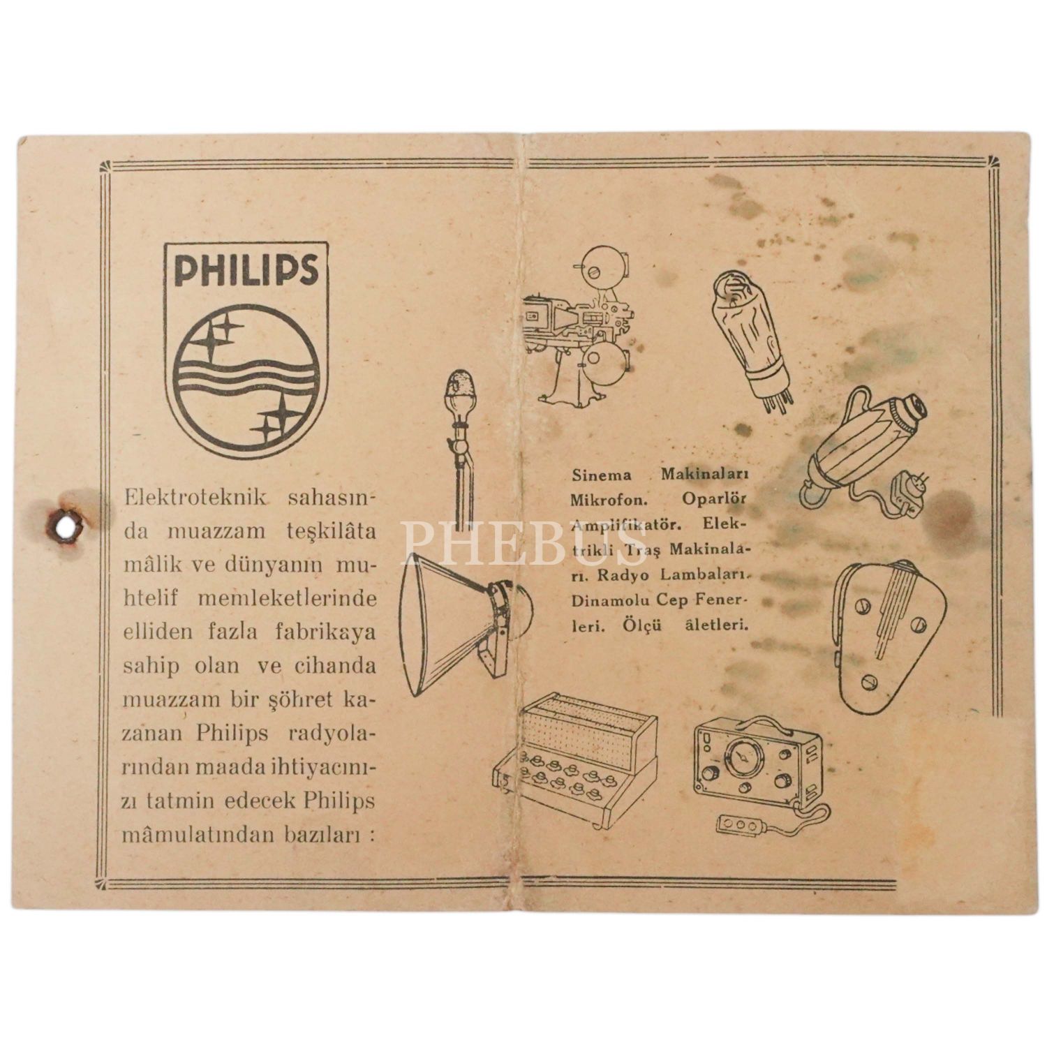 "Elektroteknik sahasında muazzam teşkilâta mâlik ve dünyanın muhtelif memleketlerinde elliden fazla fabrikaya sahip olan ve cihanda muazzam bir şöhret kazanan Philips radyolarından maada ihtiyacınızı tatmin edecek Philips mâmulatından bazılar: Sinema Makinaları, Mikrofon, Oparlör, Amplifikatör, Elektrikli Traş Makinaları, Radyo Lambaları, Dinamolu Cep Fenerleri, Ölçü Âletleri."