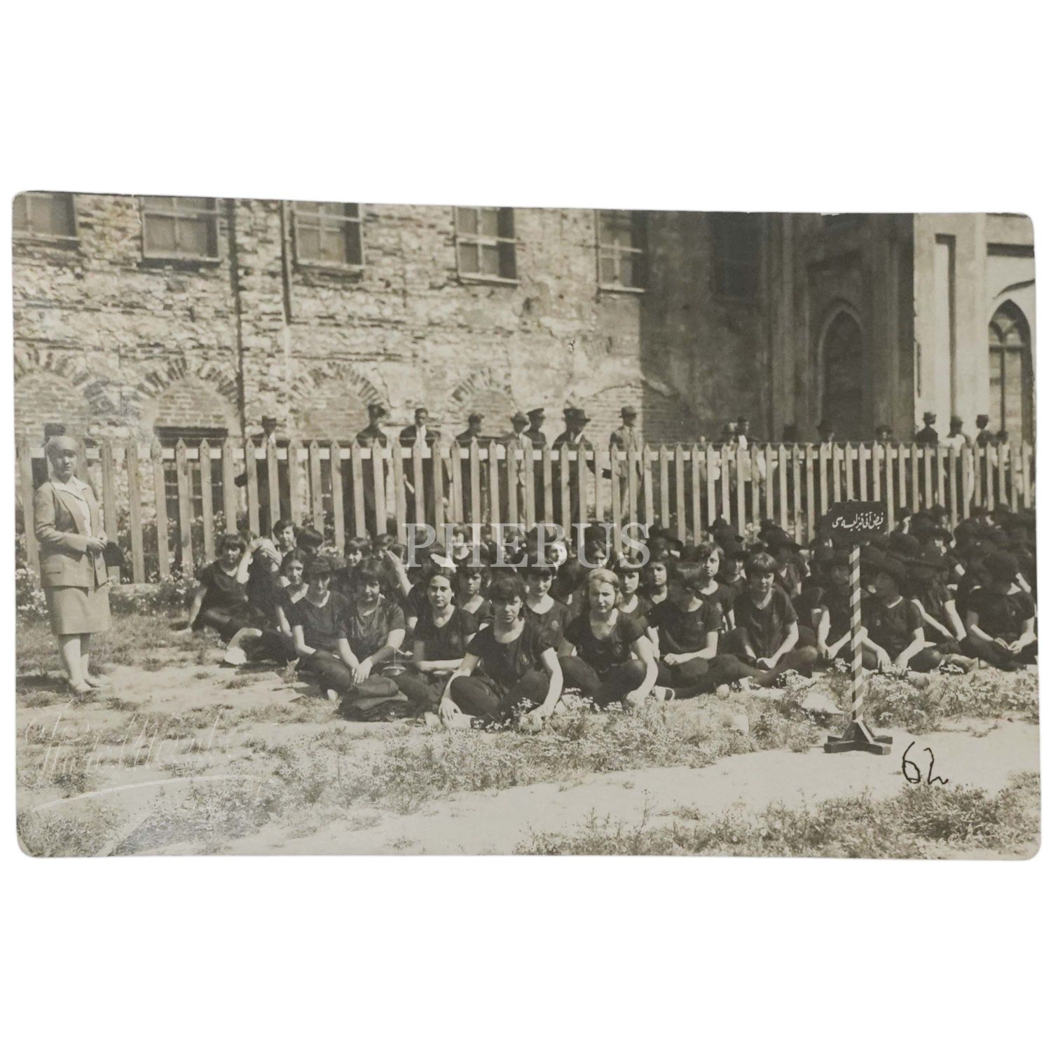 İsveçli Beden Eğitimi Öğretmeni Inka Nermann önderliğinde 11 Mayıs 1928 tarihinde Taksim Topçu Kışlası´nın avlusunda gerçekleştirilen Jimnastik Bayramı´nda, Feyz-i Ati Kız Lisesi öğrencilerinin dinlenirken çekilmiş fotoğrafı, "Photo Weinberg" soğuk damgalı, 14x9 cm...