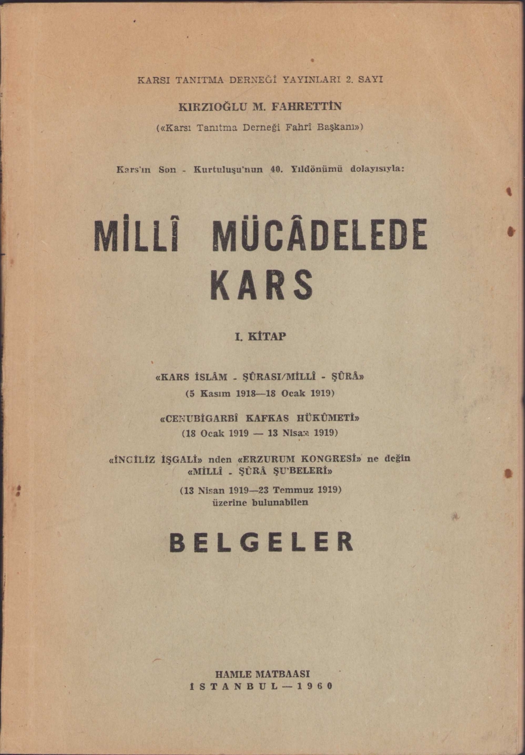 Milli Mücadelede Kars - 1. kitap, Kırgızoğlu M. Fahrettin Hamle Matbaası, İstanbul, 1960, 80 sayfa, 16x24 cm