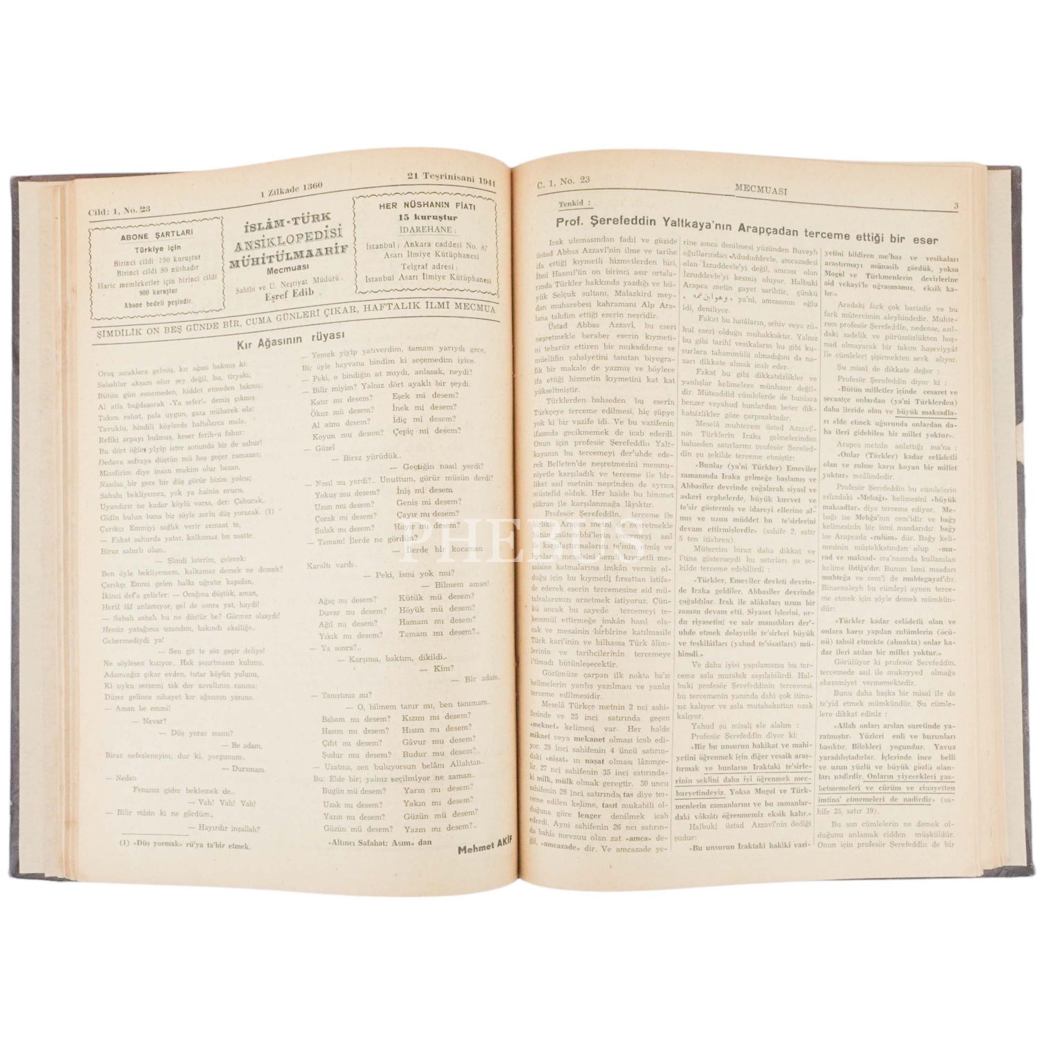 İSLÂM - TÜRK MUHİTÜLMAARİF MECMUASI´nın (İSLÂM - TÜRK ANSİKLOPEDİSİ) 1941 ilâ 1943 yılları arasında yayımlanan ilk 50 sayısı tek ciltte, 20x28 cm...