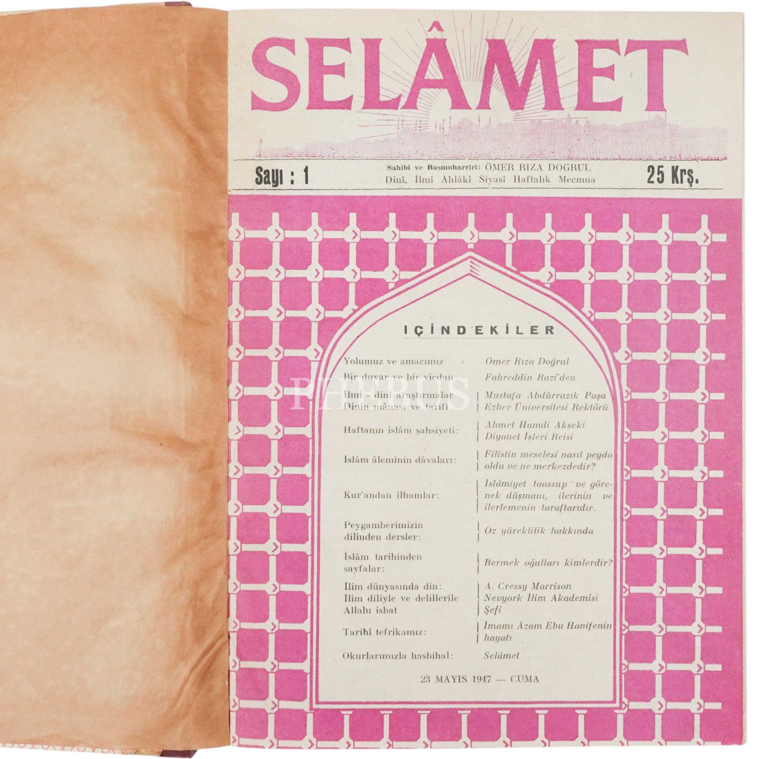 SELÂMET dergisinin 23 Mayıs 1947 ilâ 14 Kasım 1947 yılları arasında yayımlanan SELÂMET dergisinin ilk 26 sayısı tek ciltte,
