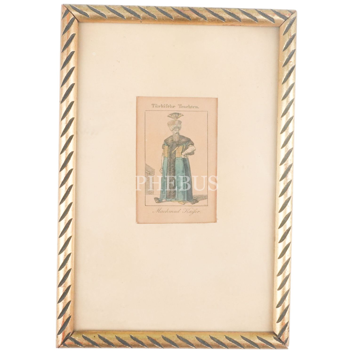 Bir Osmanlı/Türk Kostümleri kitabından renkli Sultan Mahmud (Machmud Kaiser) kostümü gravürü, gravür 4,5x6,5 cm, çerçeve 14x20 cm...