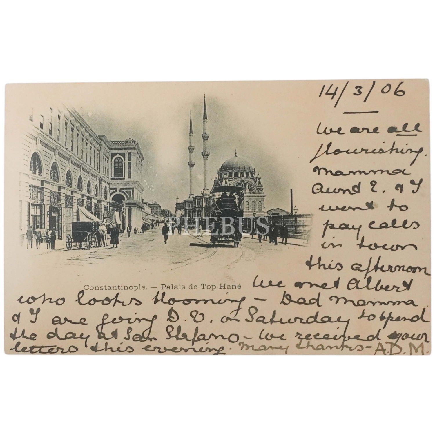 İstanbul - Tophane, Tophane Müşirliği, Nusretiye Camii ve çift katlı tramvay, "Constantinople - Palais de Top-Hane", 14x9 cm...