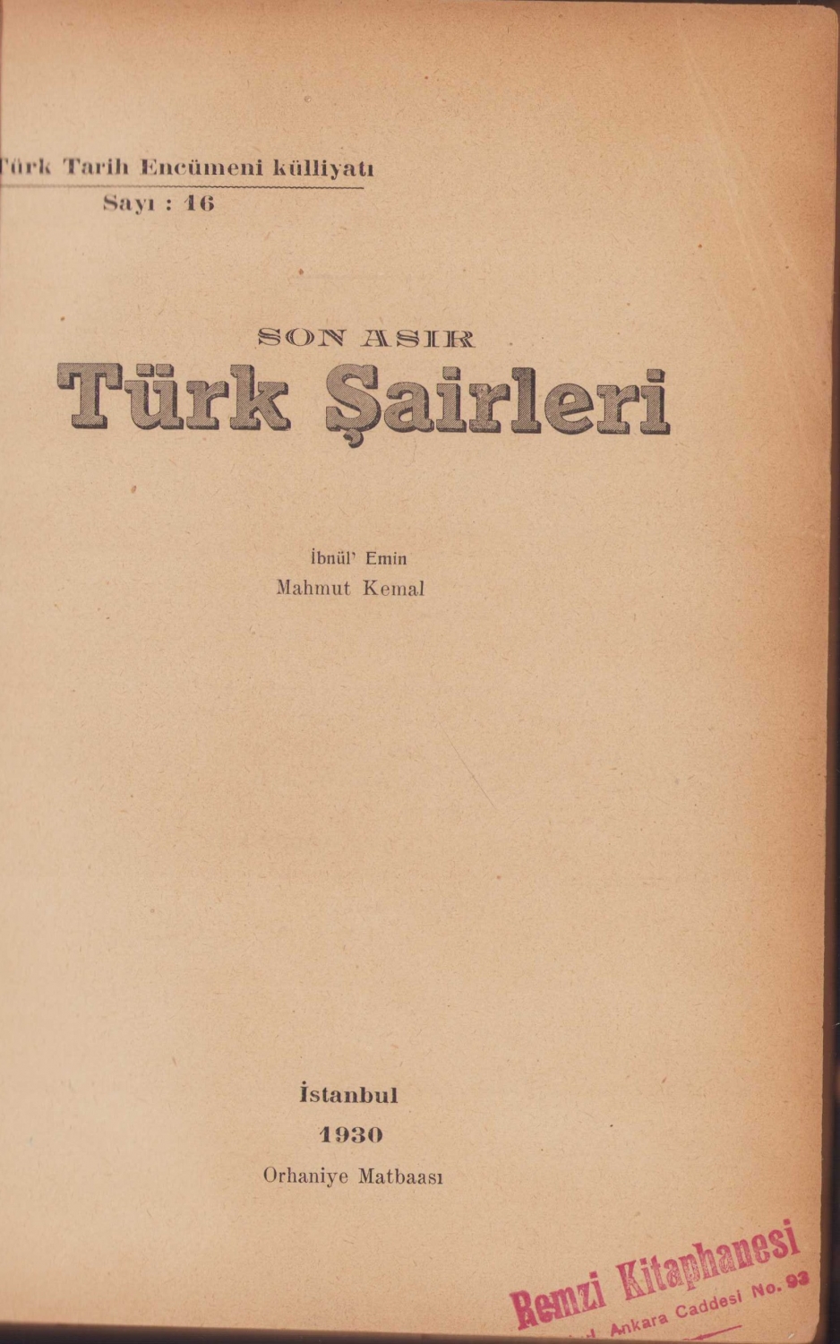 Son Asır Türk Şairleri, Mahmut Kemal, Orhaniye Matbaası, İstanbul, 1930, cilt kapağı haliyle, 384 sayfa, 16x24 cm
