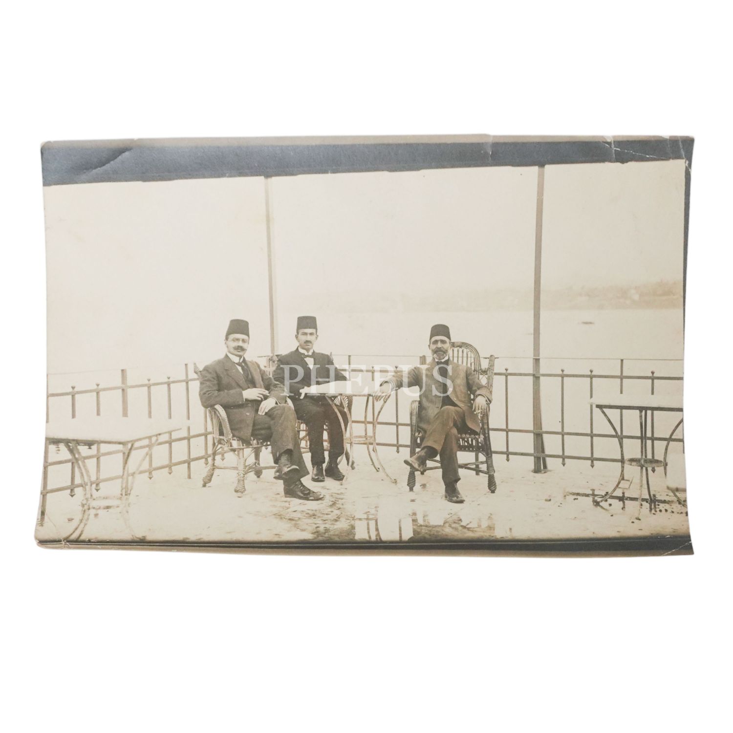 Üç fesli beyefendinin, Boğaziçi´ne(?) nazır bir mekanda aldırdıkları hatıra fotoğrafı, 14x9 cm...
