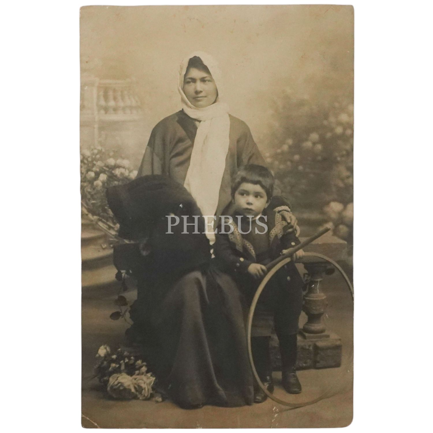 Bir anne ile elinde hulahopla poz veren çocuğunun stüdyo hatıra fotoğrafı, 9x14 cm...