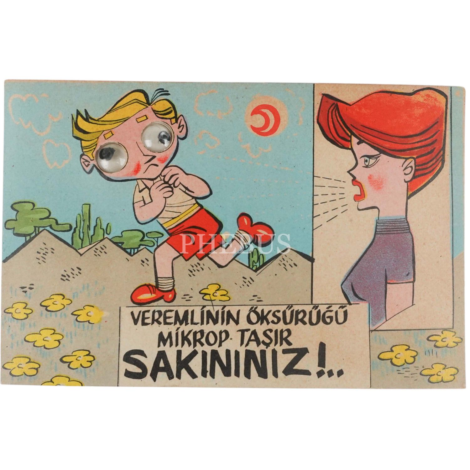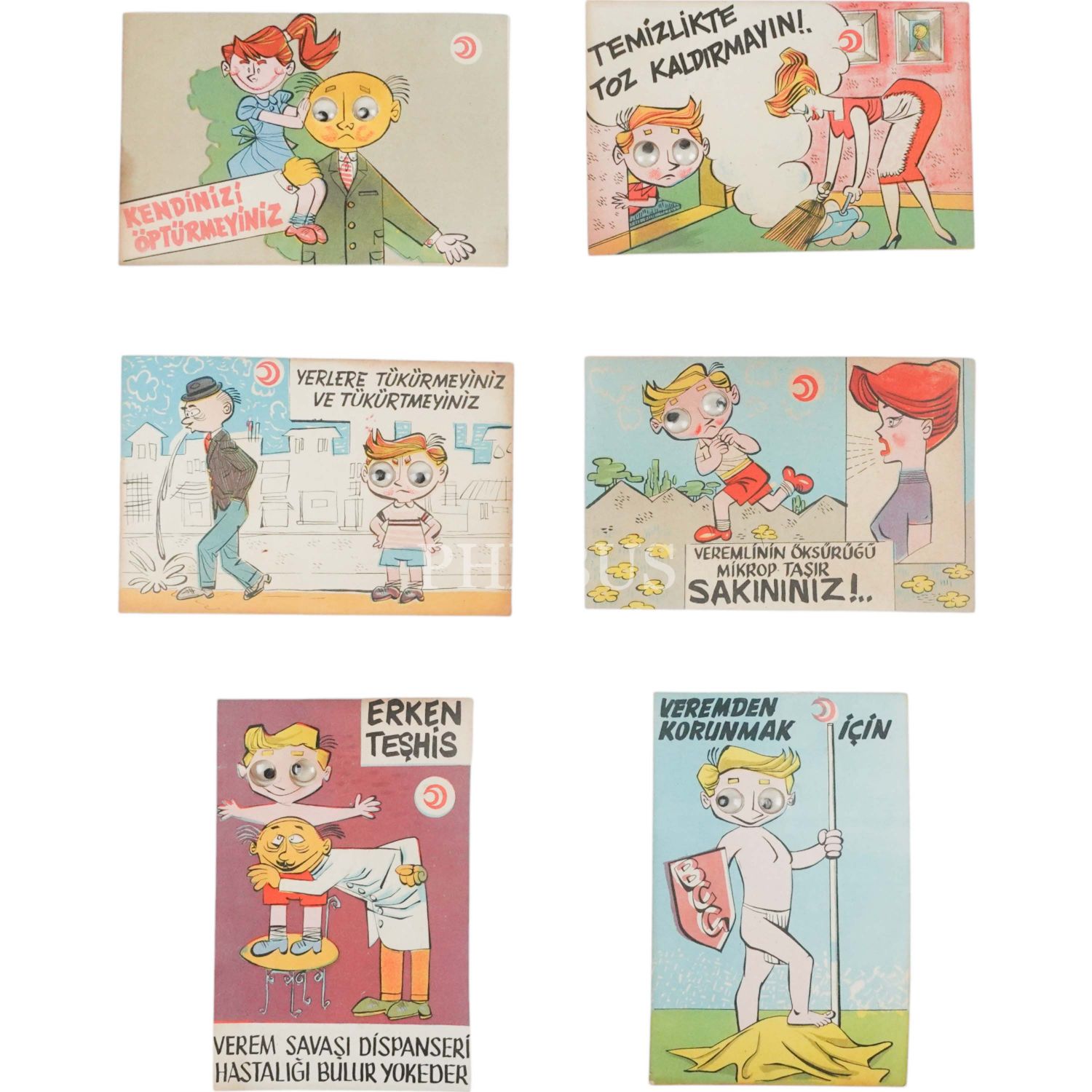 Türkiye Ulusal Verem Savaşı Derneği tarafından yayımlanan, vereme karşı tedbirler konulu altı adet çizim kartpostal, çizgiler meşhur karikatüristimiz Oğuz Aral´a aittir, 13x9 cm...