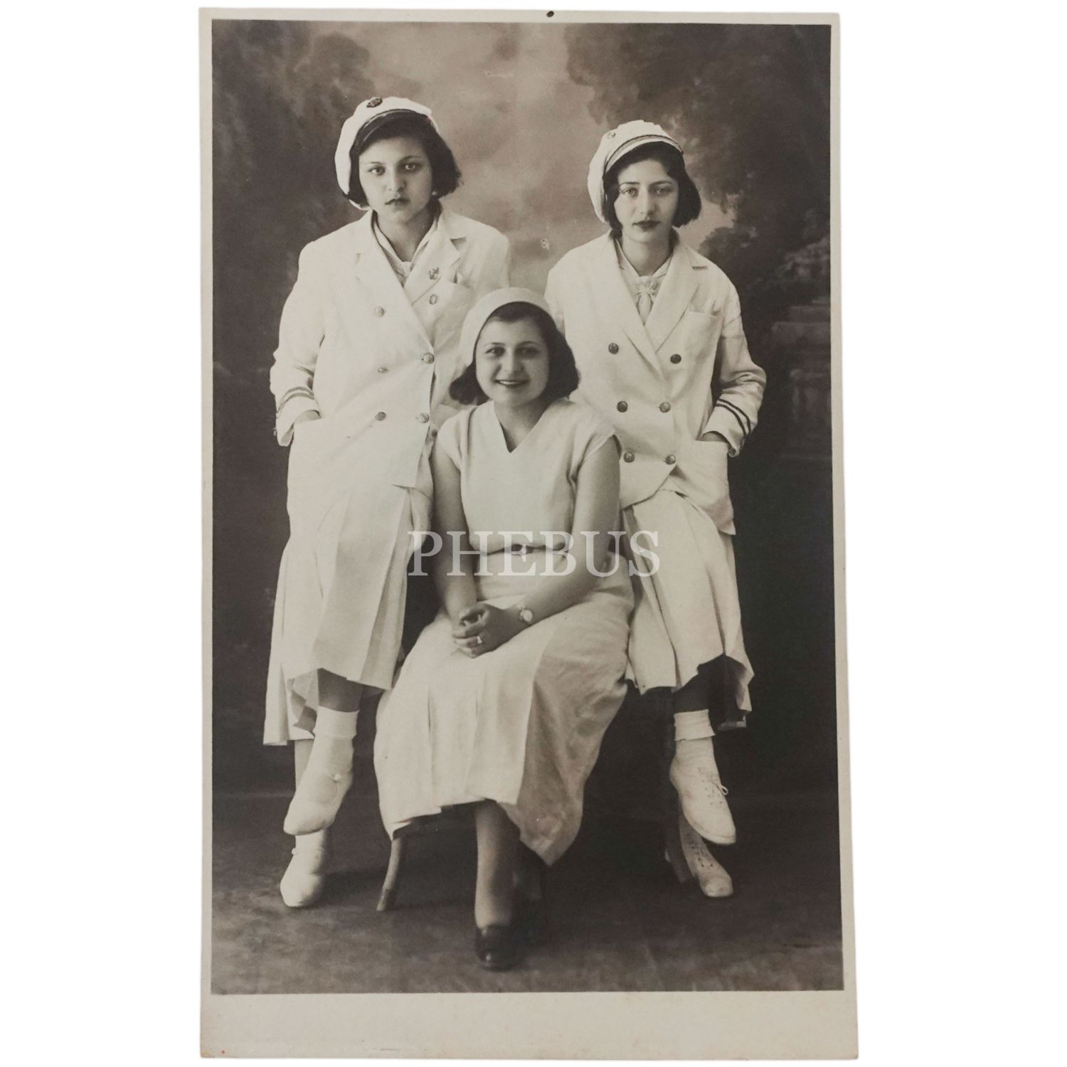 İkisi denizci kostümü giymiş üç genç kadının stüdyo hatıra fotoğrafı, "Foto M. Fadıl - Manisa" damgalı, 9x14 cm...