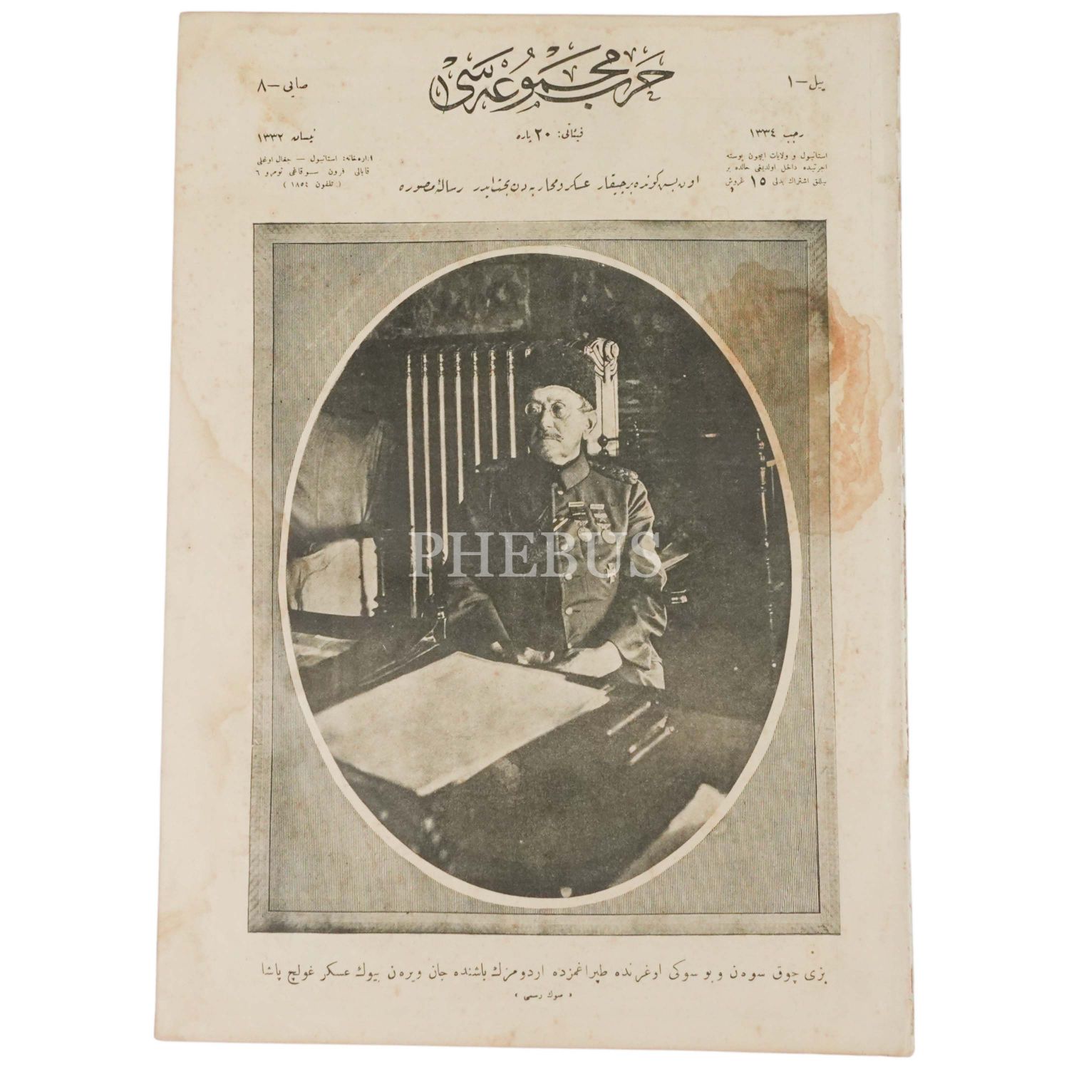 Türk dostu Goltz (Golç) Paşa´nın vefatından önce çekilen son fotoğrafına kapağında yer veren HARB MECMUASI´nın 8. sayısı, Nisan 1332, 25x34 cm...
