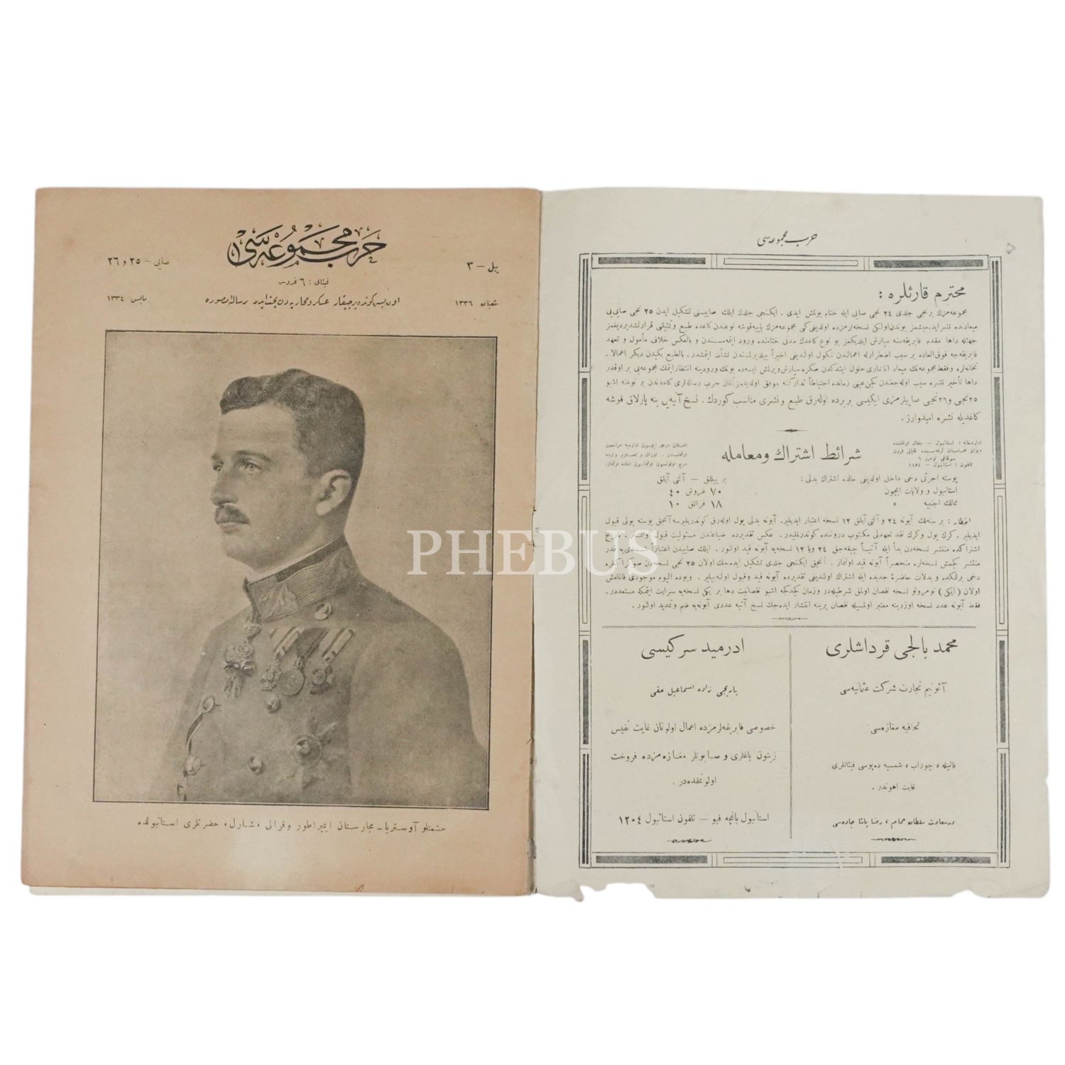 Osmanlı Devleti´nin I. Dünya Savaşı´nda müttefiki Avusturya-Macaristan´ın İmparatoru I. Charles´in fotoğrafına kapağında yer veren HARB MECMUASI´nın Mayıs 1334 tarihli 25-26. sayıları, 26x34 cm...