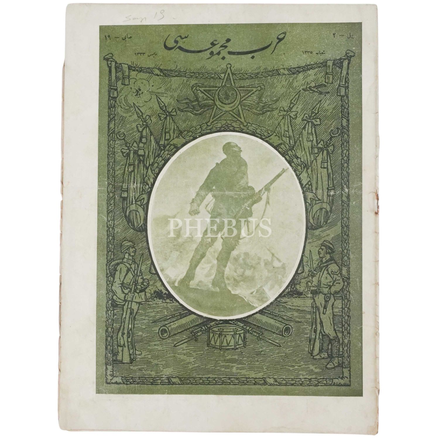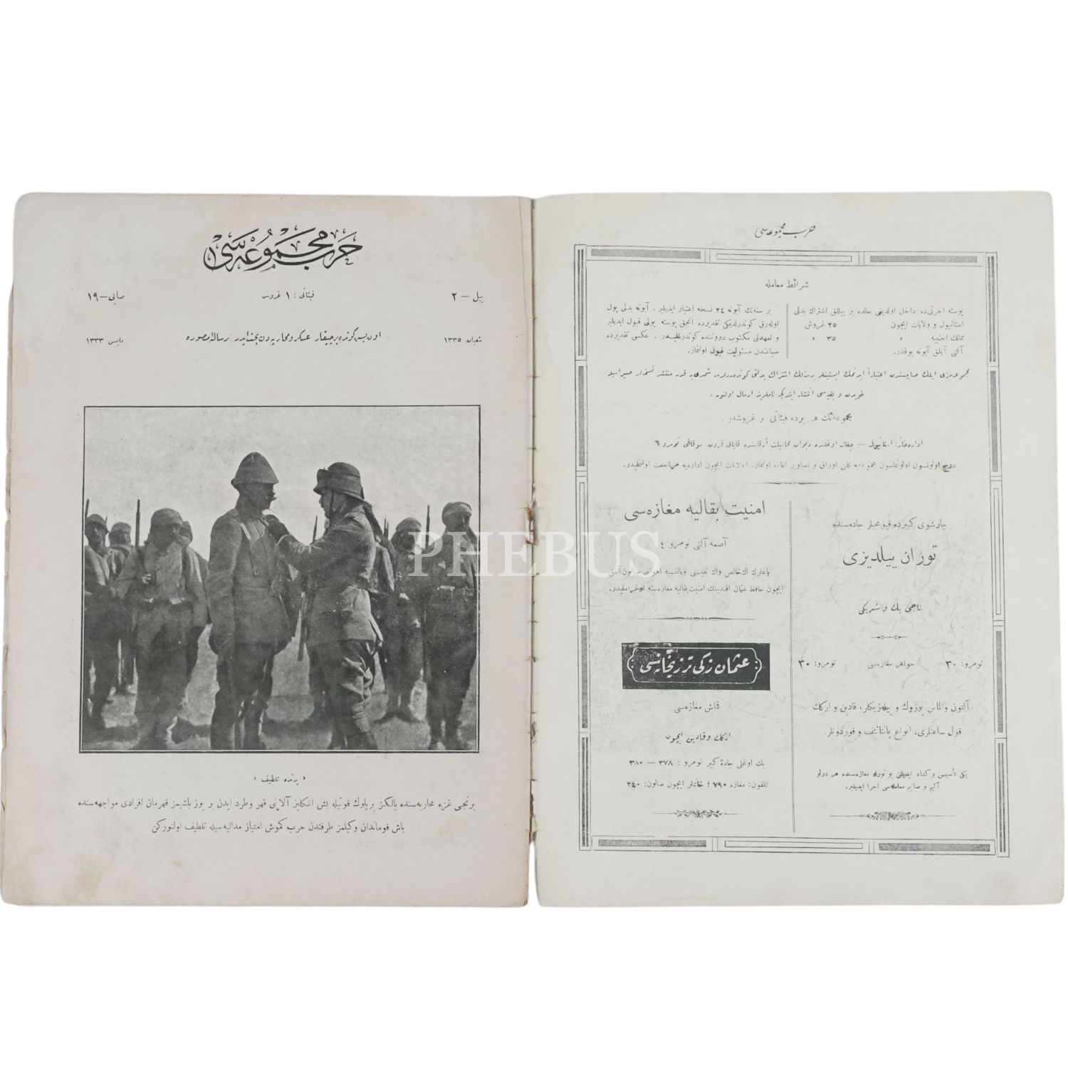 Birinci Gazze Muharebesi´nde yalnızca bir bölük askerle İngilizlere karşı zafer kazanan bir subaya Enver Paşa tarafından madalya takılırken çekilen fotoğrafa kapağında yer veren HARB MECMUASI´nın Mayıs 1333 tarihli 19. sayısı, 26x34 cm.. .