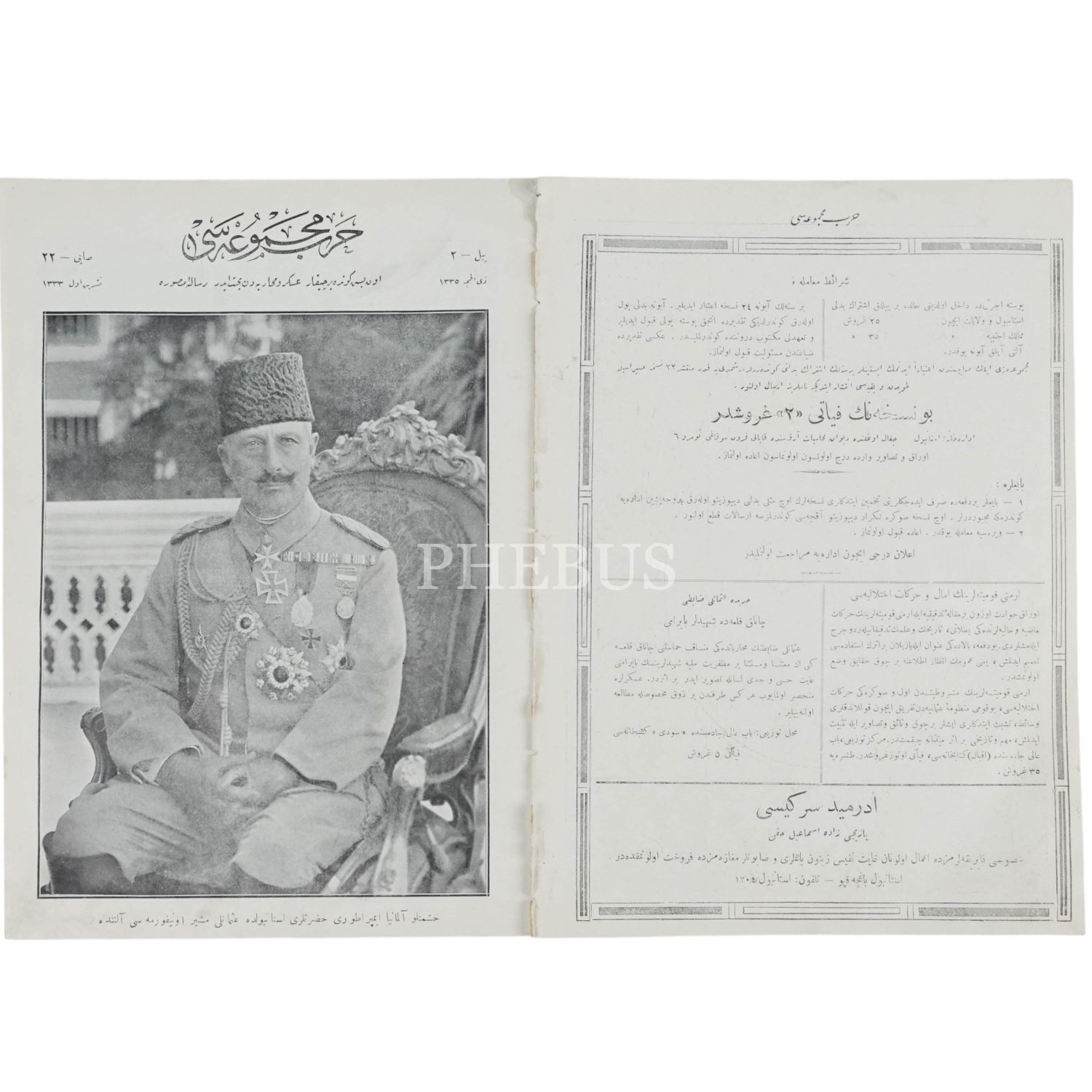 Osmanlı mareşal üniforması giymiş Almanya İmparatoru Kayzer II. Wilhelm´in fotoğrafına kapağında yer veren HARB MECMUASI´nın Teşrinievvel 1333 tarihli 22. sayısı, 26x34 cm...