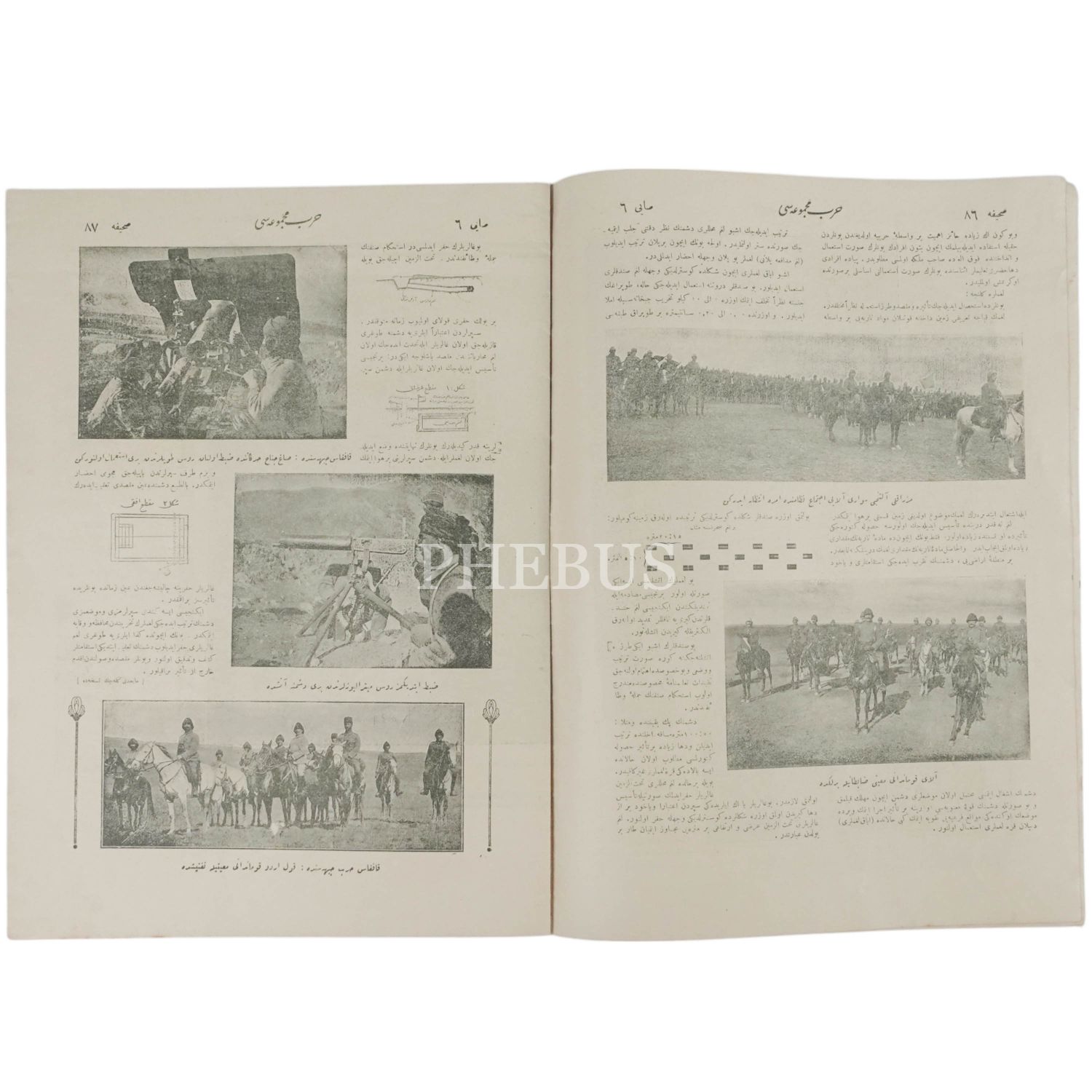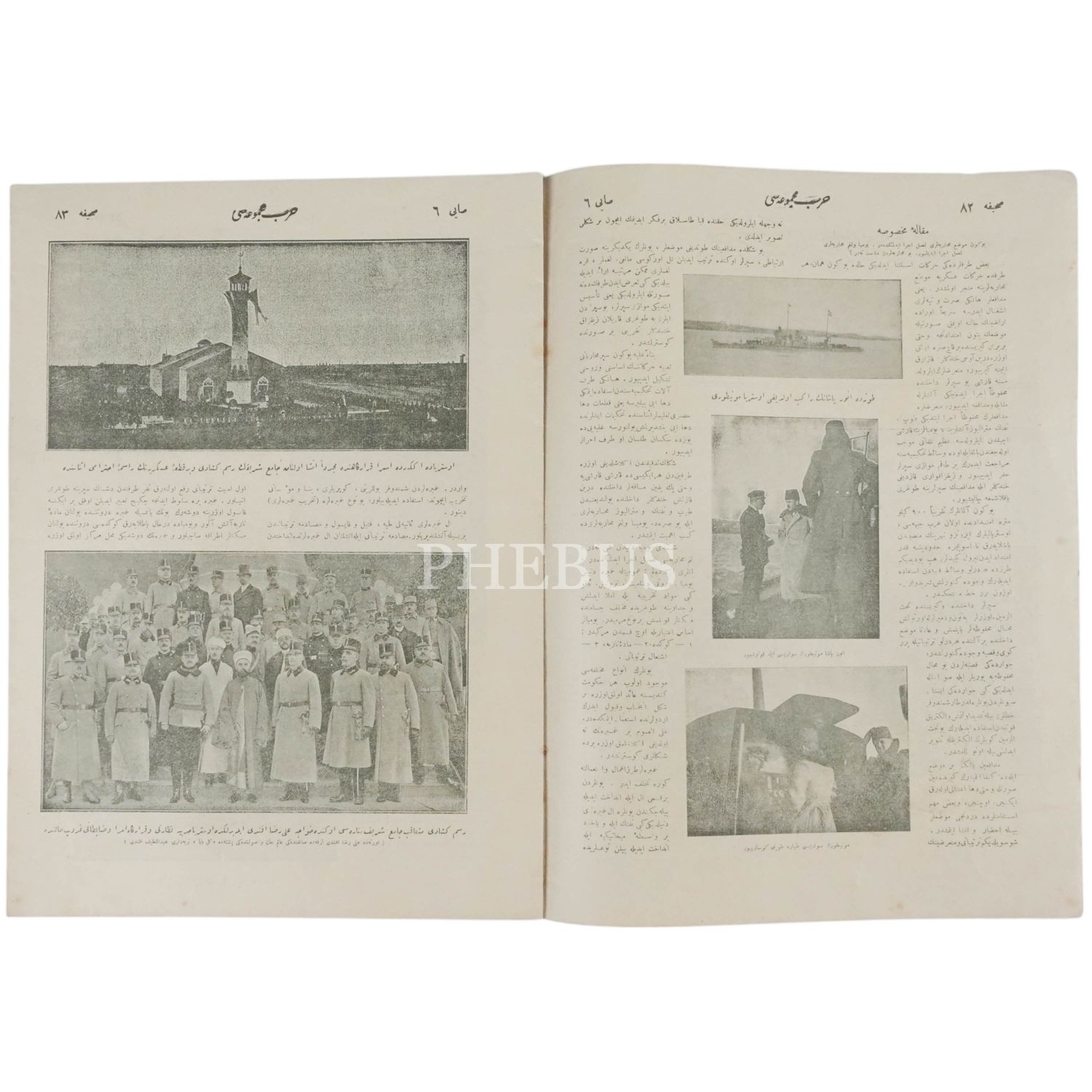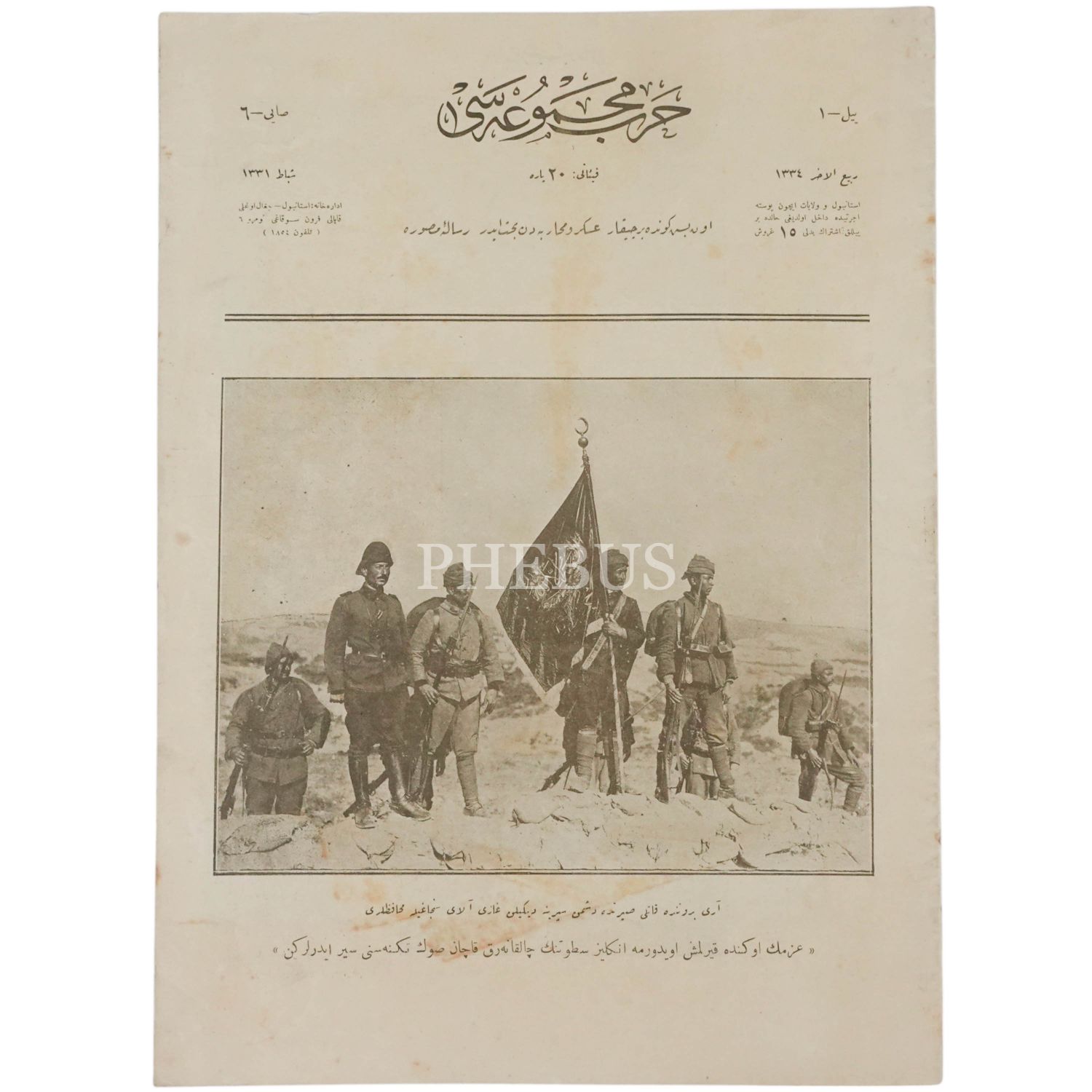 Arıburnu´nda düşman siperlerine dikilmiş Gazi Alay Sancağı ve muhafızlarının fotoğrafına kapağında yer veren HARB MECMUASI´nın Şubat 1331 tarihli 6. sayısı, 26x34 cm...