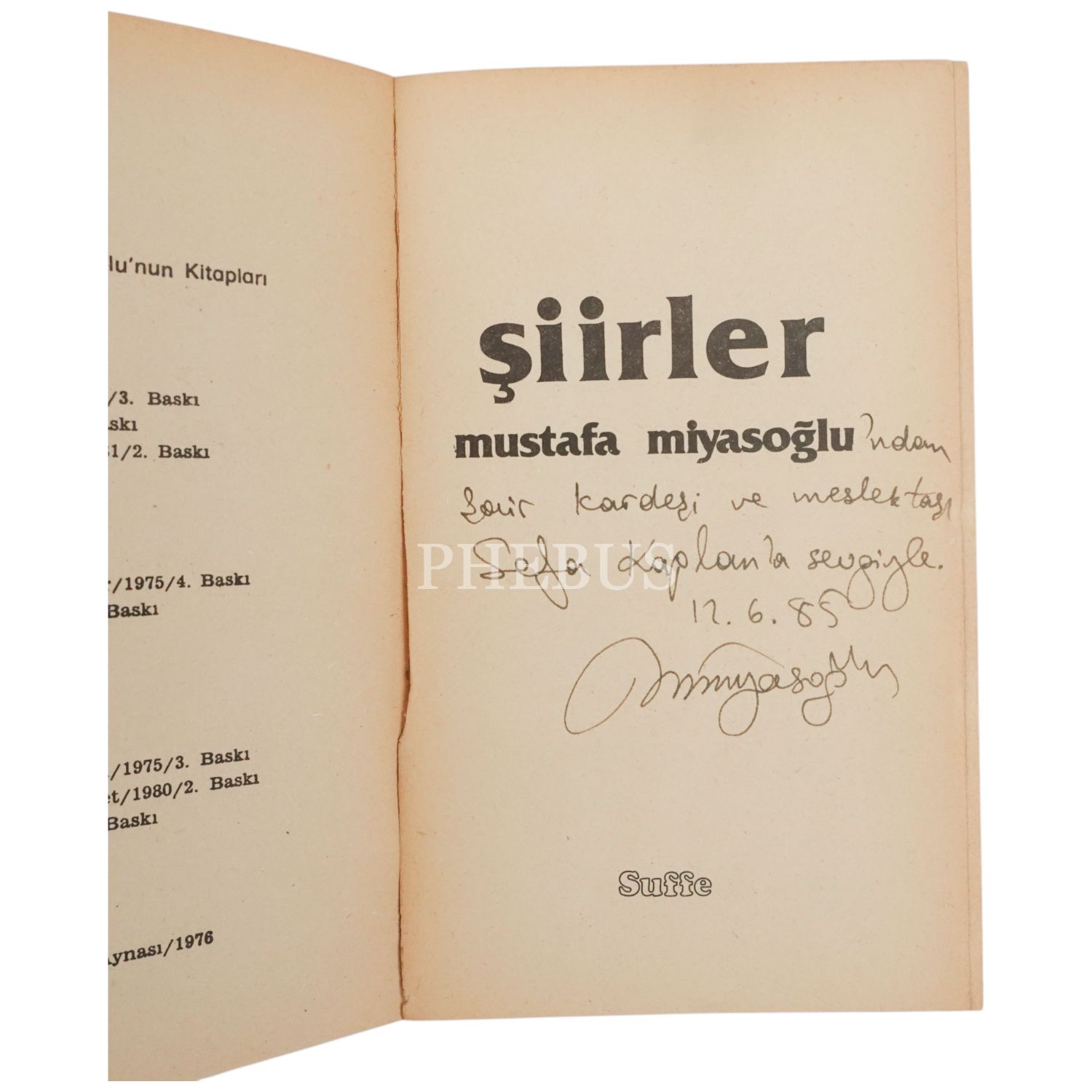 "Mustafa Miyasoğlu´ndan şair kardeşi ve meslektaşı Sefa Kaplan´a sevgiyle" ithafıyla 12 Haziran 1985 tarihinde imzalanmıştır.