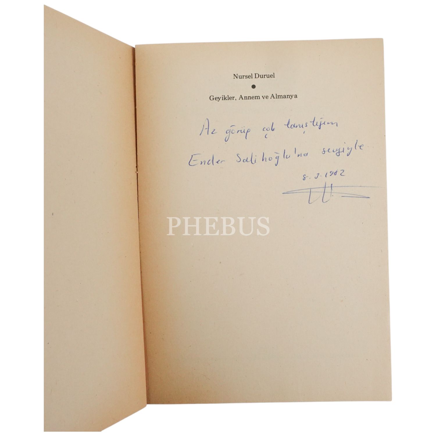 Nursel Duruel´in ilk hikaye kitabının ilk baskısı... "Az görüp çok tanıştığım Ender Salihoğlu´na sevgiyle" ithafıyla 8 Mart 1982 tarihinde imzalanmıştır.