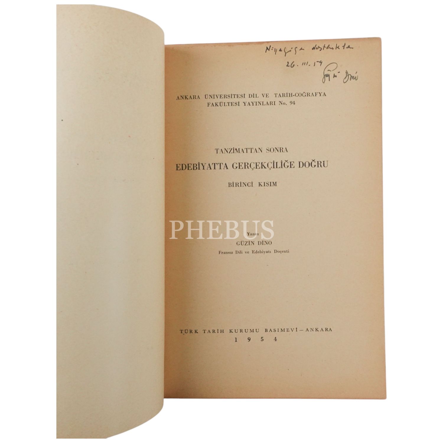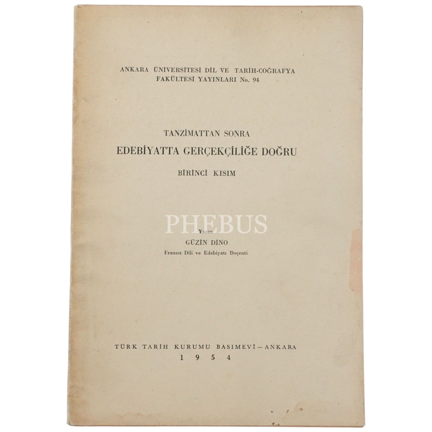 TANZİMATTAN SONRA EDEBİYATTA GERÇEKÇİLİĞE DOĞRU (Birinci Kısım), Güzin Dino, 1954, Ankara Üniversitesi Dil ve Tarih-Coğrafya Fakültesi Yayınları No. 94, 55 sayfa, 17x24 cm...