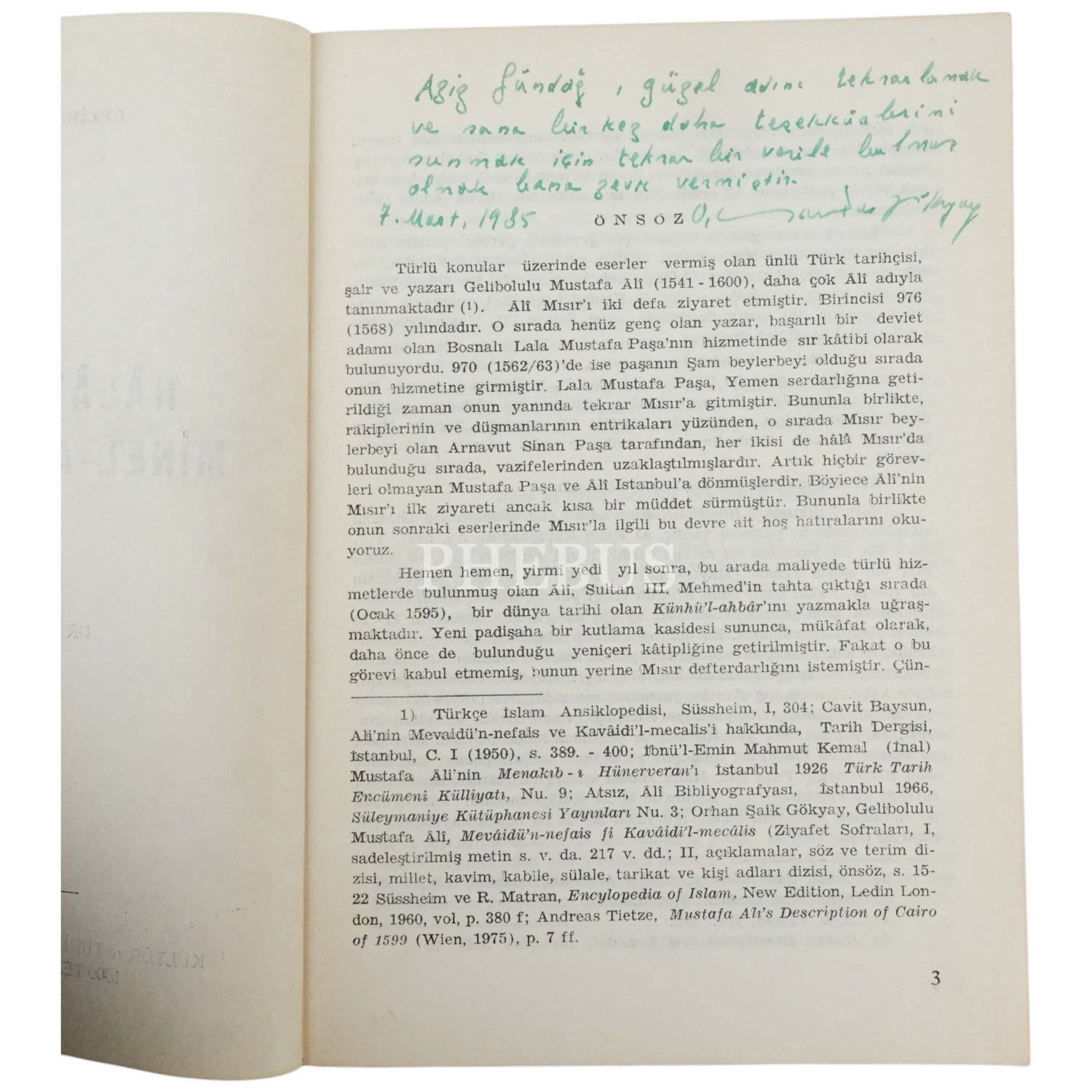 "Aziz Gündağ, güzel adını tekrarlamak ve sana bir kez daha teşekkürlerimi sunmak için tekrar bir vesile bulmuş olmak bana zevk vermiştir." ithafıyla 7 Mart 1985 tarihinde imzalanmıştır.