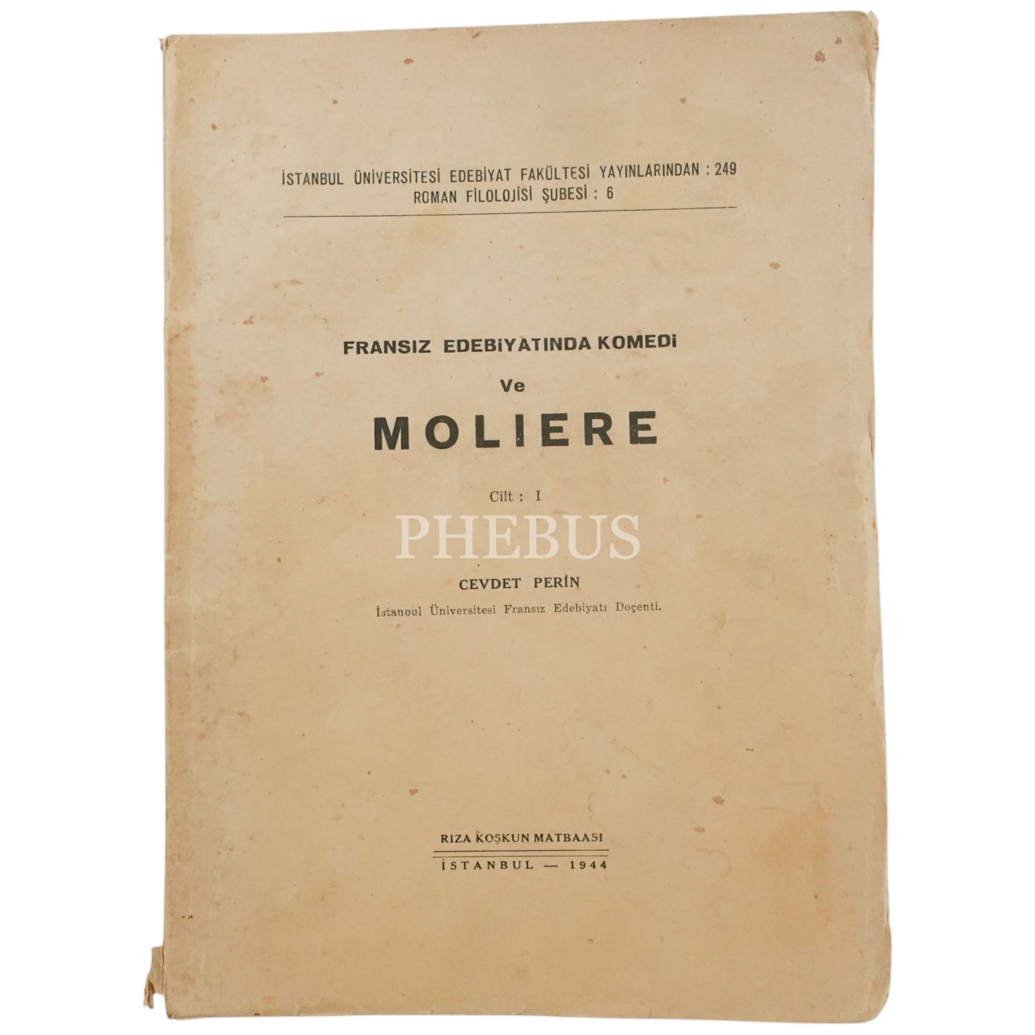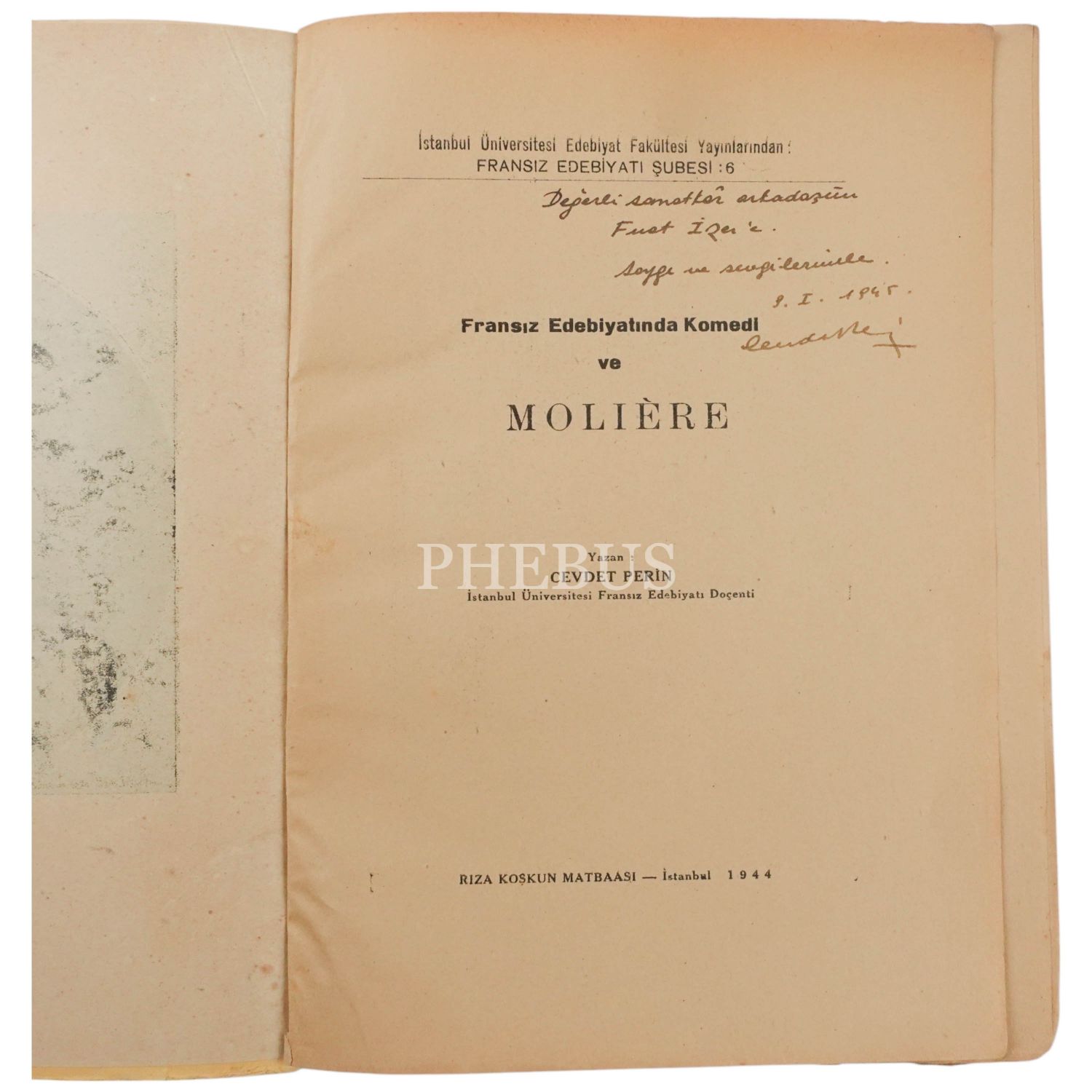 FRANSIZ EDEBİYATINDA KOMEDİ VE MOLIERE, Cevdet Perin, 1944, İstanbul Üniversitesi Edebiyat Fakültesi Yayınlarından: Fransız Edebiyatı Şubesi: 6, 133 sayfa metin + tablolar, 19x25 cm...