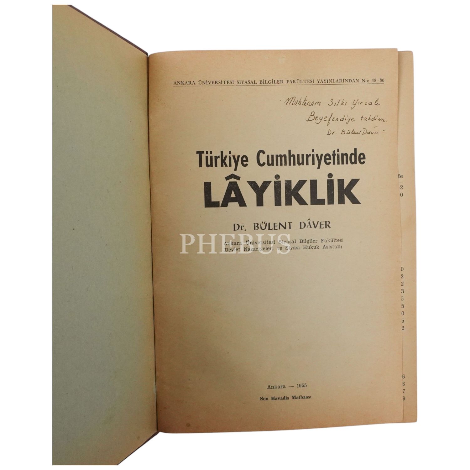 TÜRKİYE CUMHURİYETİNDE LÂYİKLİK, Bülent Dâver, 1955, Ankara Üniversitesi Siyasal Bilgiler Fakültesi Yayınlarından No: 48-30, 259 sayfa, 17x24 cm...
