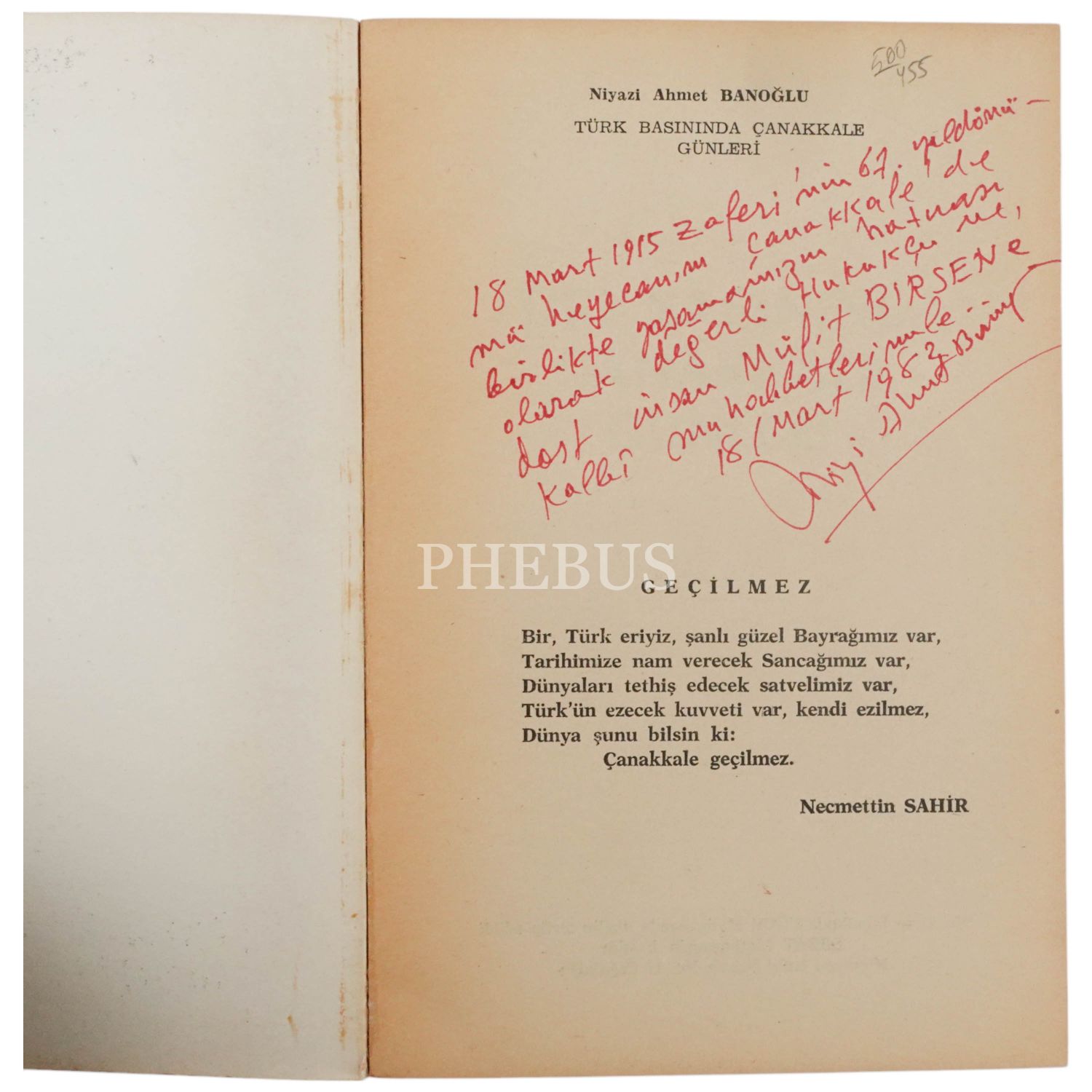 "18 Mart 1915 Zaferi´nin 67. yıldönümü heyecanını Çanakkale´de birlikte yaşamamızın hatırası olarak değerli Hukukçu ve dost insan Müfit BİRSEN´e kalbî muhabbetlerimle." ithafıyla, 18 Mart 1982 tarihinde imzalanmıştır.