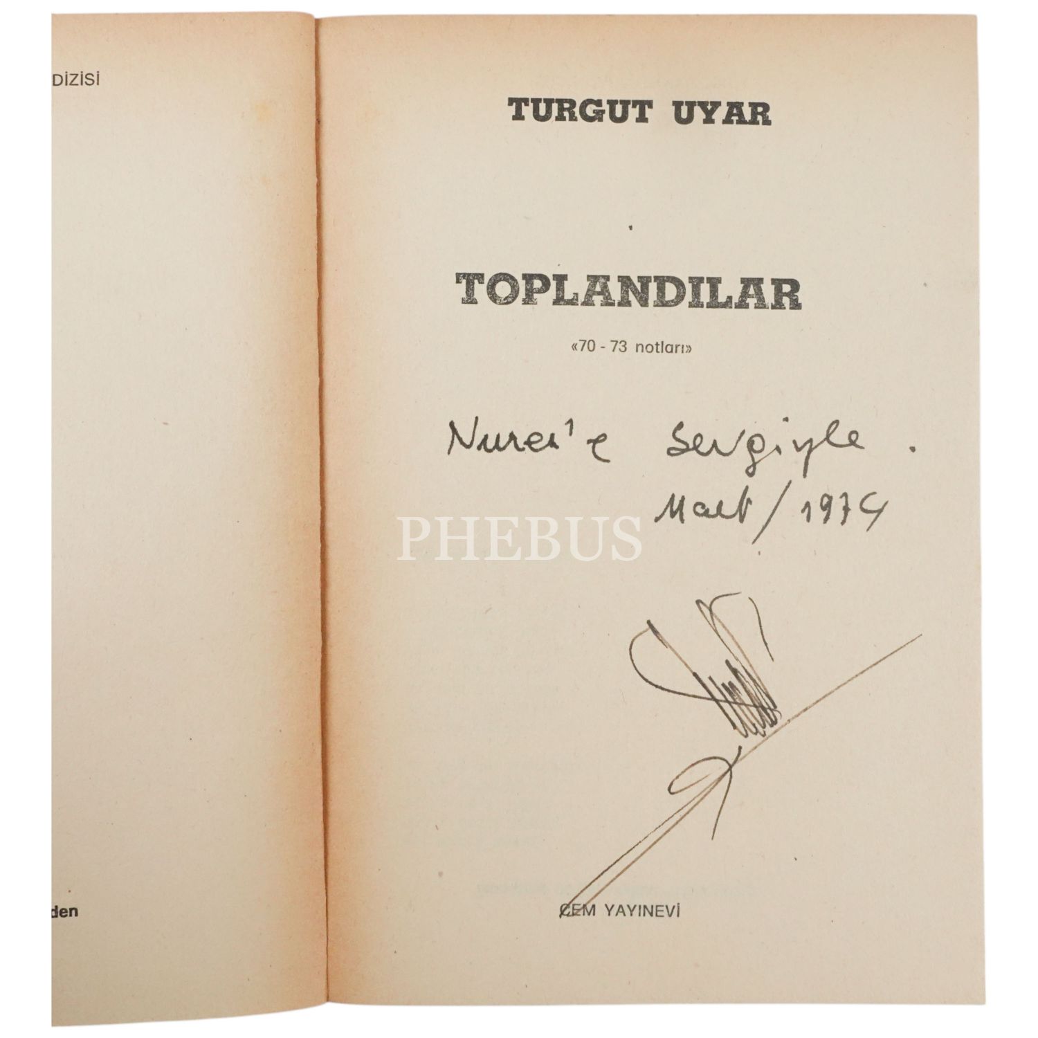Turgut Uyar´ın, İkinci Yeni anlayışıyla yazdığı şiirlerinden meydana gelen eserinin ilk baskısı... "Nurer´e sevgiyle." ithafıyla Mart 1974 tarihinde imzalanmıştır.