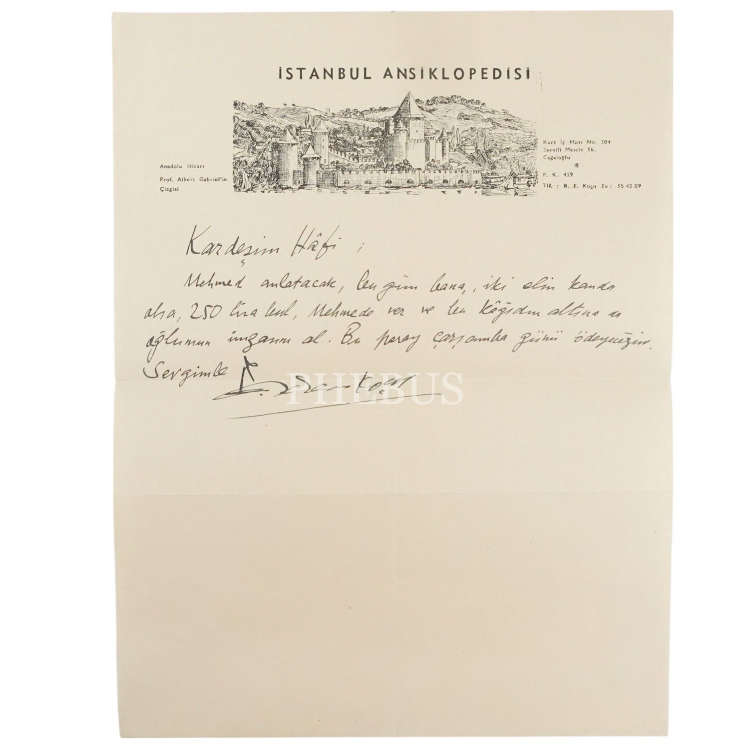 Reşad Ekrem Koçu´nun, İstanbul Ansiklopedisi antetli kâğıda yazdığı ve muhatabından aciliyetli olarak 250 Lira borç talep ettiği, el yazısı mektubu, 23x29 cm...