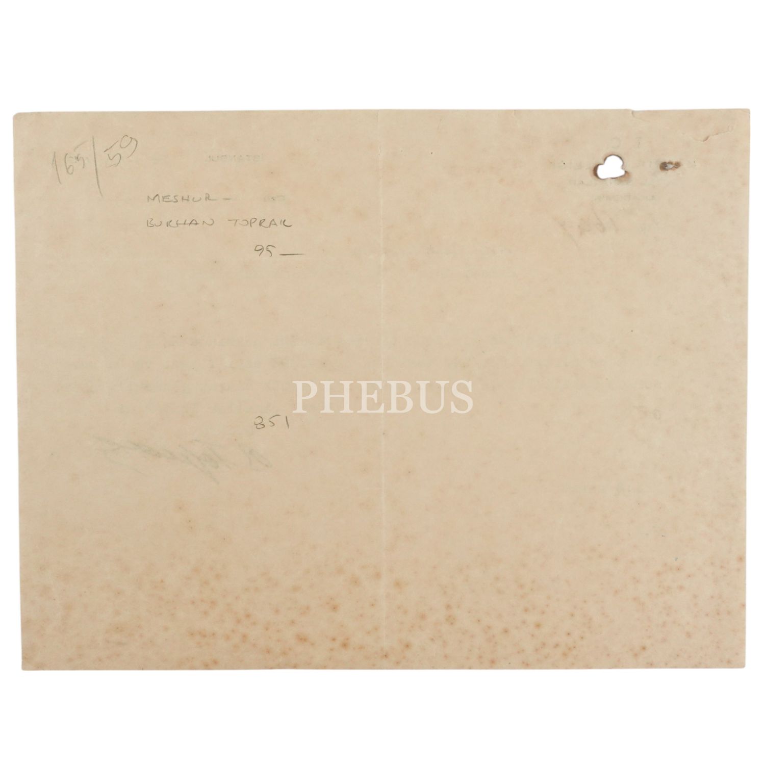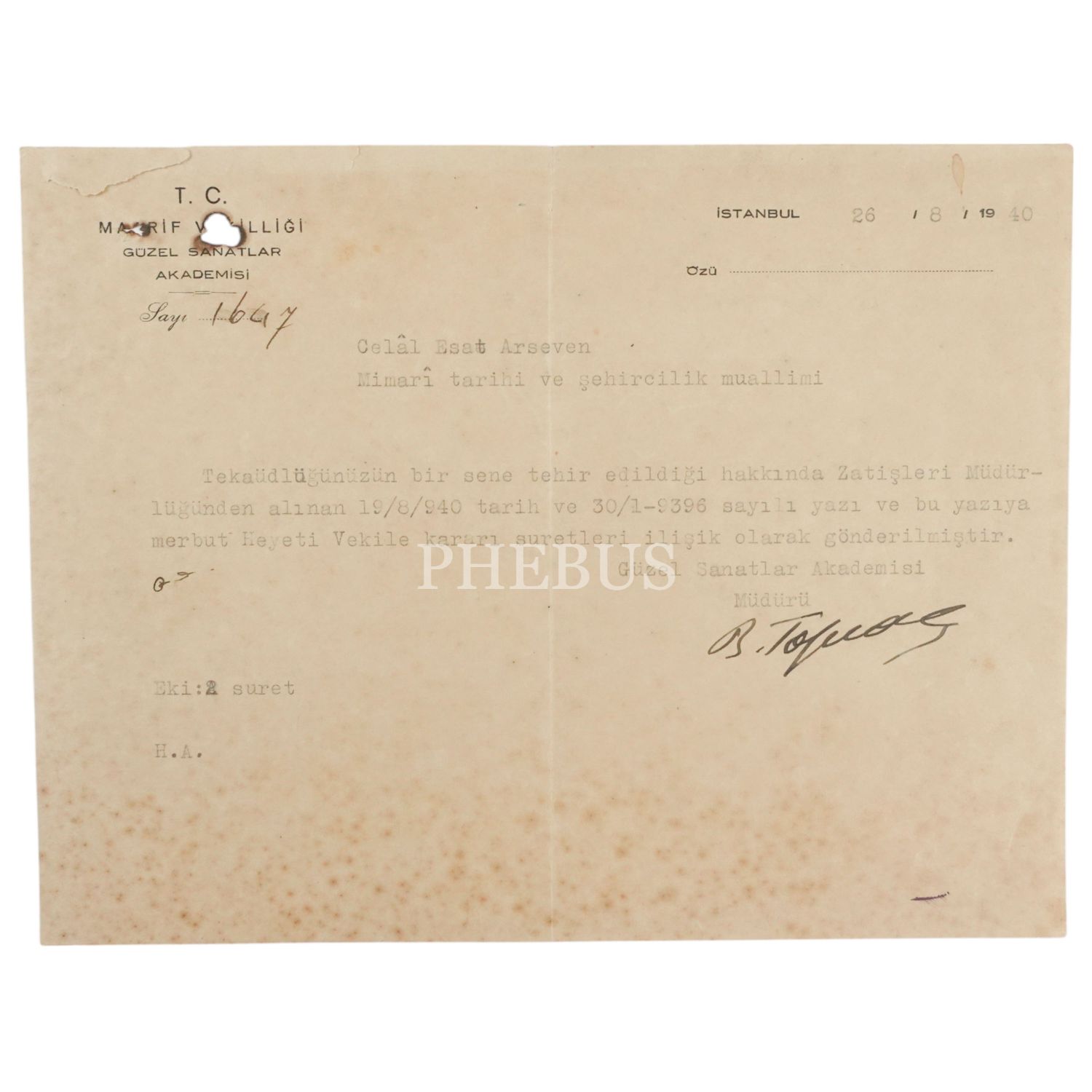 "Güzel Sanatlar Akademisi Müdürü" Burhan Toprak´ın ıslak imzasıyla, "Mimarî Tarihi ve Şehircilik Muallimi" Celâl Esad Arseven´e emekliliğinin bir sene ertelendiğini bildiren daktilo yazı, 26 Ağustos 1940, 21x16 cm...