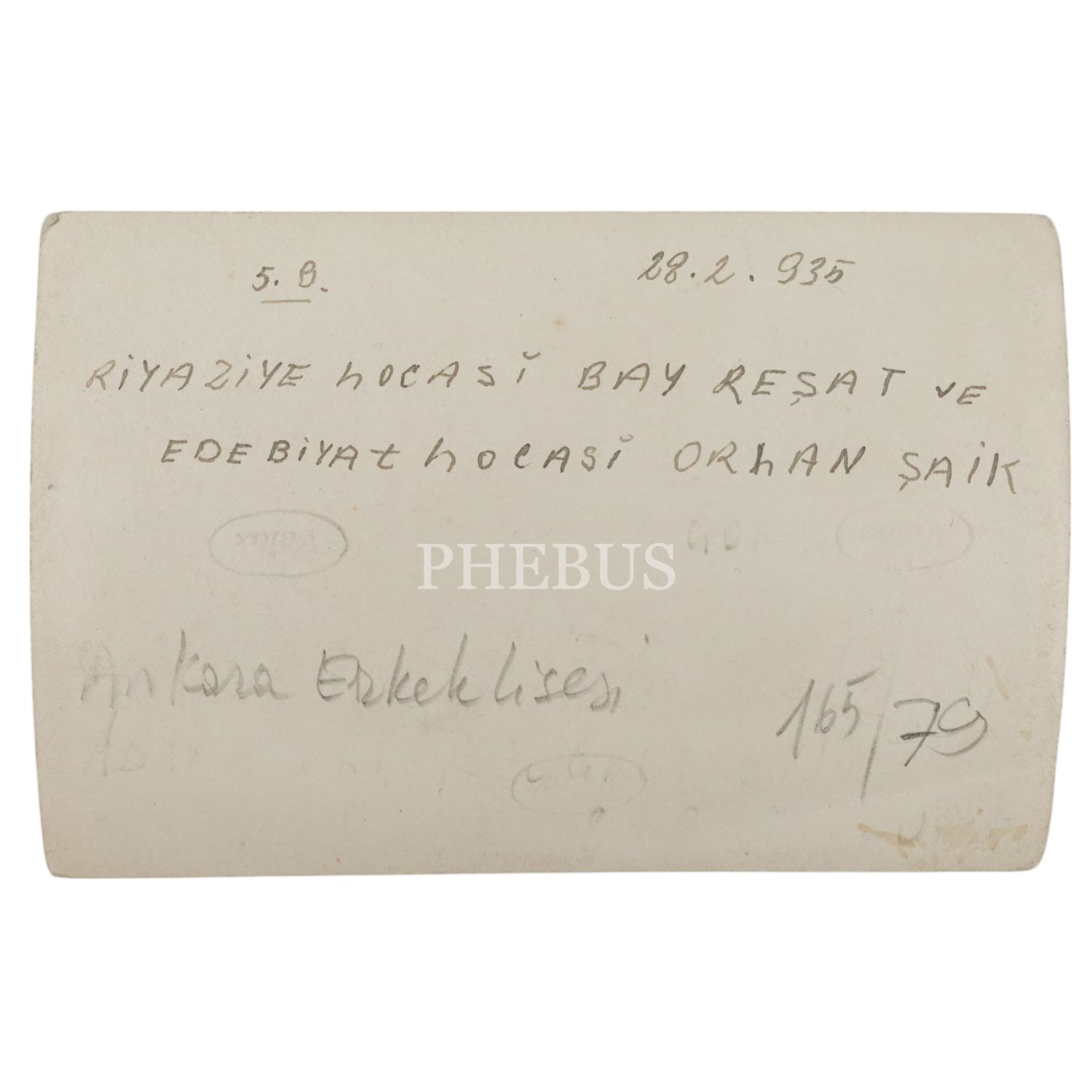 Arka yüzüne 28 Şubat 1935 tarihinde yeni harflerle düşülen not: Riyaziye hocası Bay Reşat ve Edebiyat hocası Orhan Şaik."
