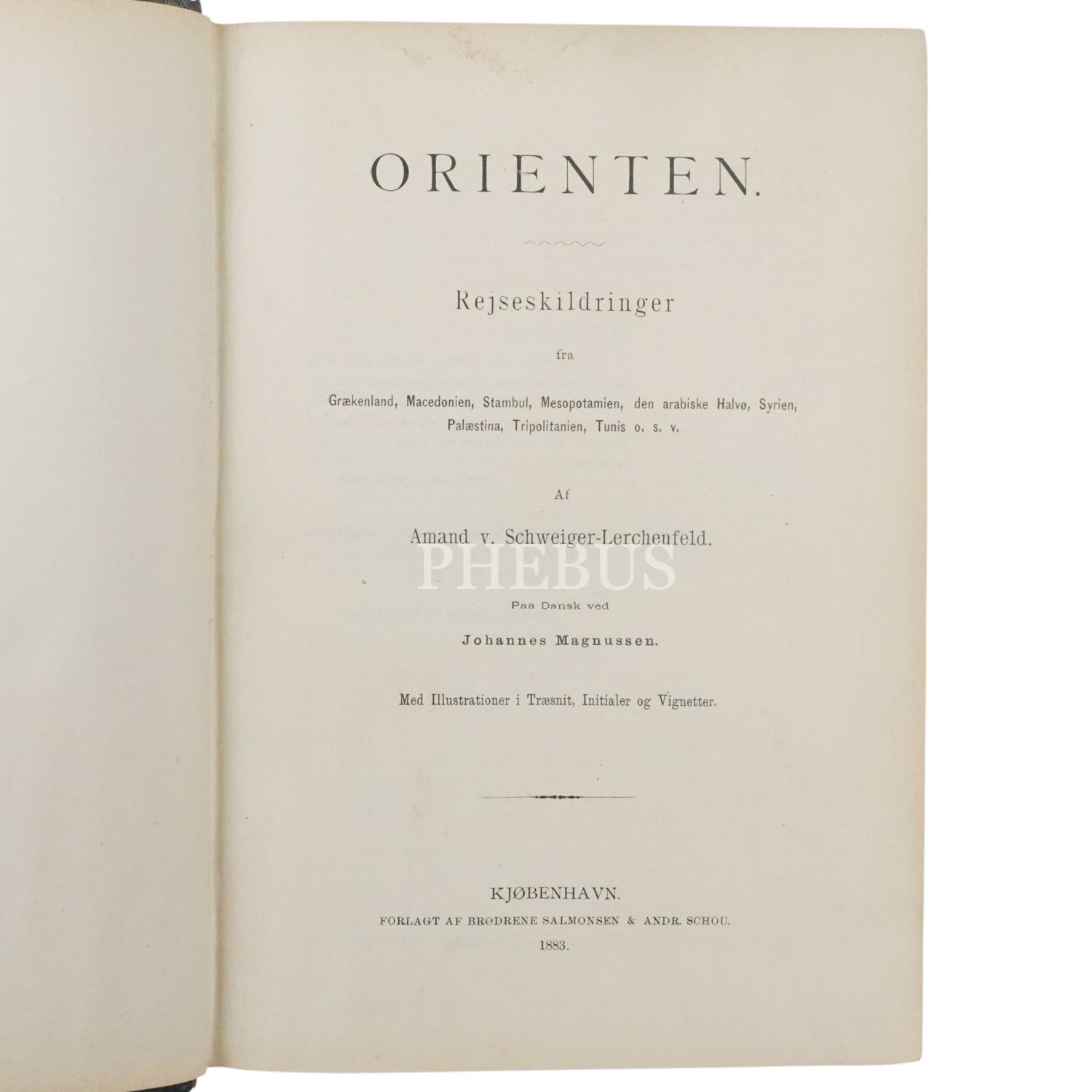 ORIENTEN: REJSESKILDRINGER, Amand v. Schweiger-Lerchenfeld, (Dancaya çeviren: Johannes Magnussen), 1883, Kjøbenhavn (Kopenhag), Forlagt af Brødrene Salmonsen, 776 sayfa, 17x23 cm...