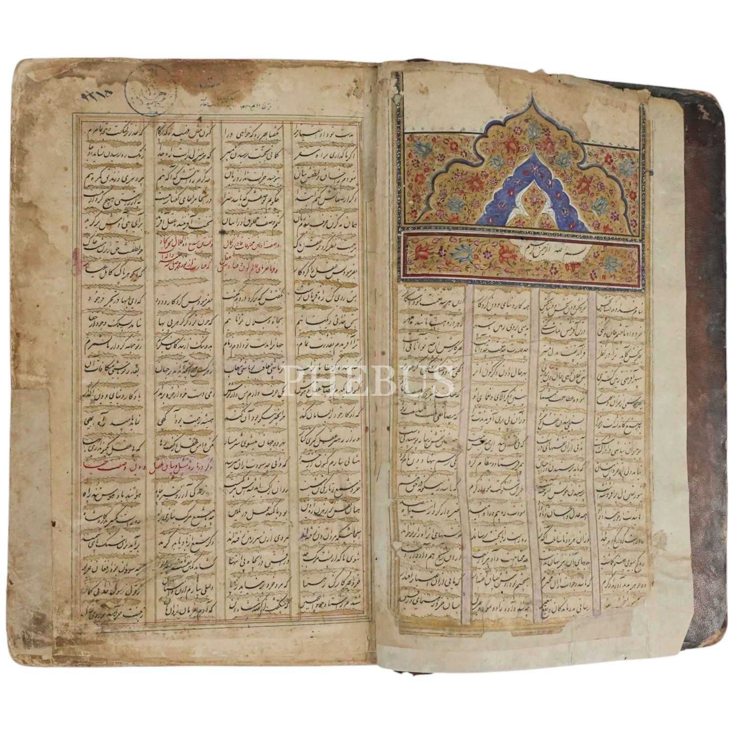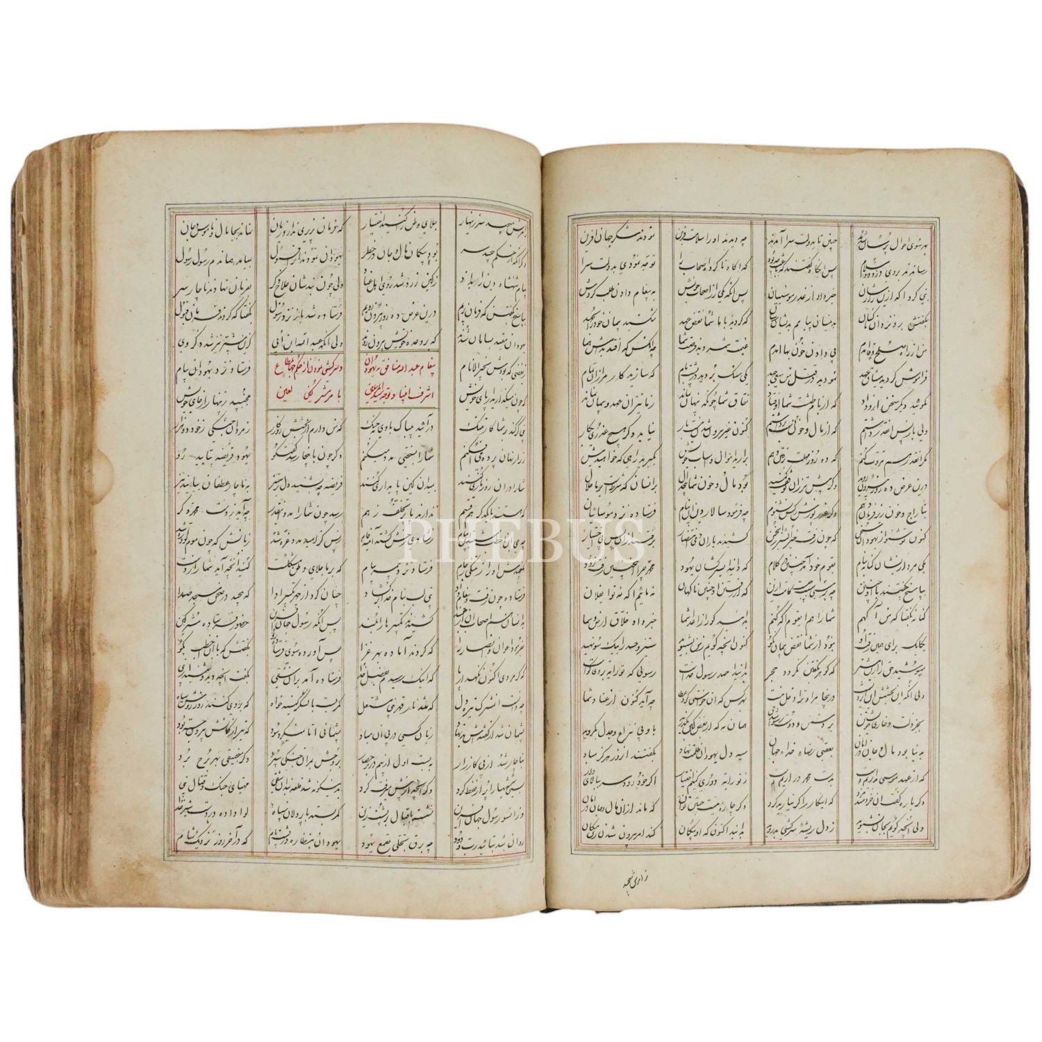 Serlevhalı, tüm sayfaları tahrirli altın cetvelli, talik yazı ile klasik İran mesnevi yazım tipinde sayfada dört sütun olarak yazılmış, deri dönem cildinde.